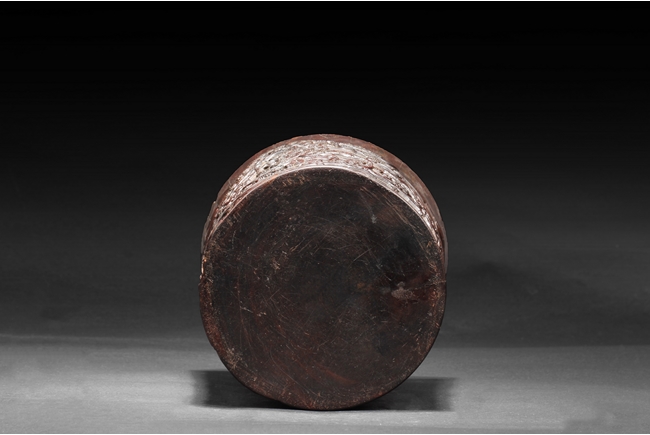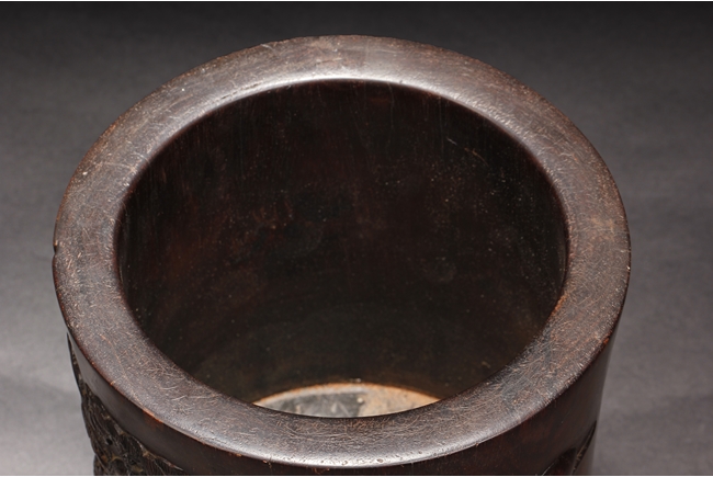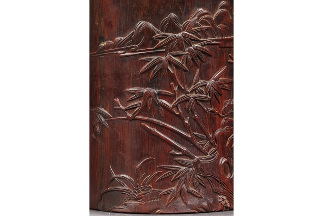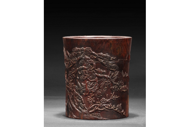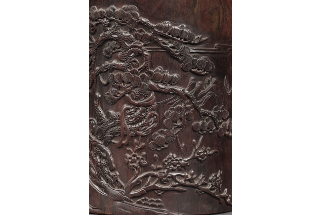 Of tapering cylindrical form, the exterior low relief carved with pine trees, prunus flowers, pine trees, and viewing stones, the wood with natural color, texture, and grains. Qing Dynasty period.