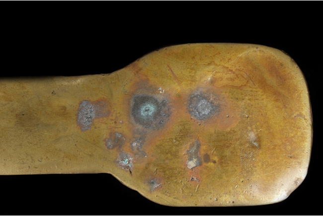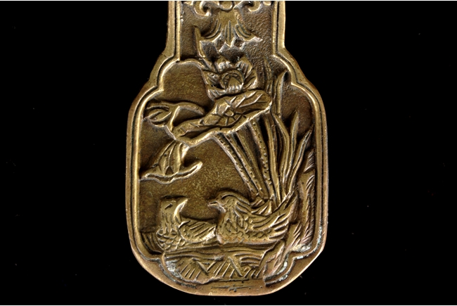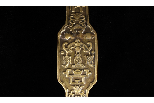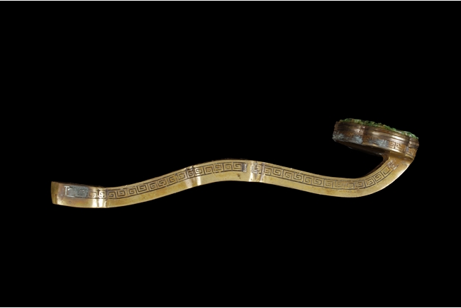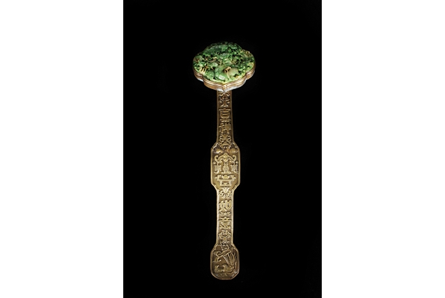 The bronze Ruyi scepter carved with flowers, bats, Chinese characters, and key-fret patterns, with a pierce carved jadeite plaque depicting dragon amidst lotus flowers at the tip, the stone with white and green color. 19th century.