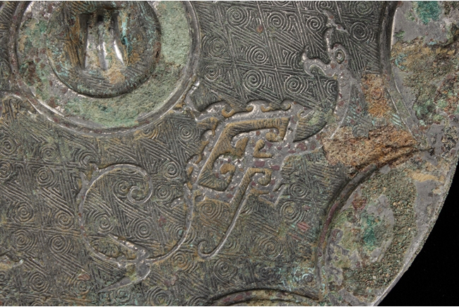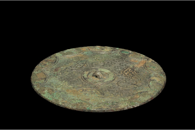 Of circular shape, the center casted with a ring knob encircled by three flying dragons, all over spiral patterns, the edge with flower petal-like patterns. Han Dynasty period.