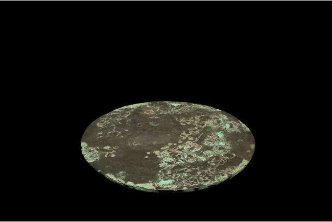 This bronze mirror is of perfectly round shape, with the decorated side having foliate patterns on the edge, pointing inwards. The patterns include Chinese characters, rounded and rectangular symbols, and objects. Center knob is of trapezoid shape. Han Dynasty period.