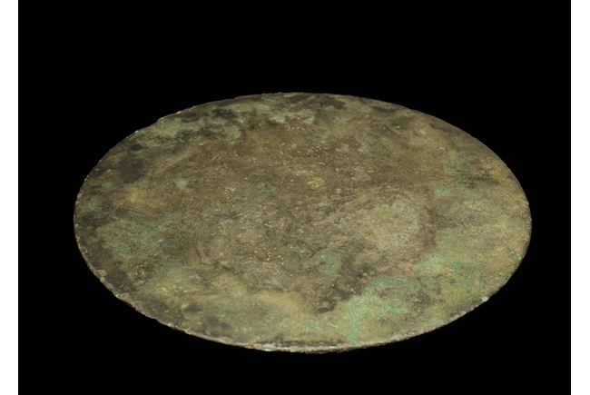 The decorated side of mirror features Chinese inscriptions, patterns, and mythical beasts, all surrounding the large center string knob. The inscription is on the outer edge of mirror, some parts slightly worn out. Song Dynasty period.