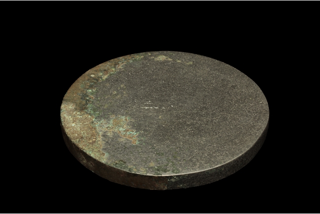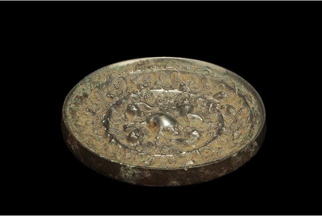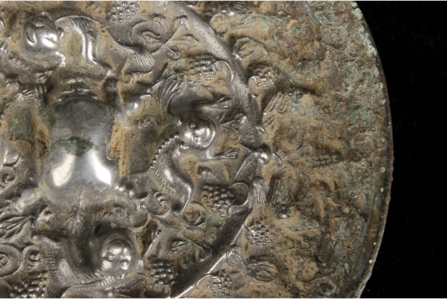 The center cast with a pierced mythical beast knob surrounded by four mythical beasts, encircled by raised and border of birds and insects, all against a grapevine ground, the wedged rim cast with a narrow band of stylized clouds. Han Dynasty period.