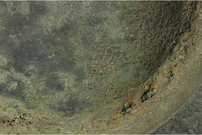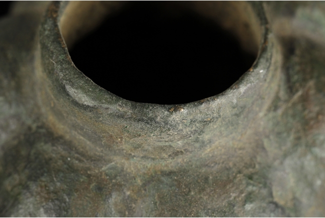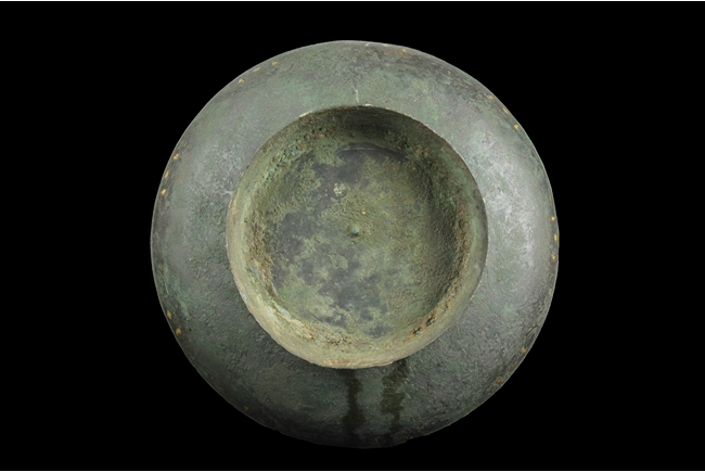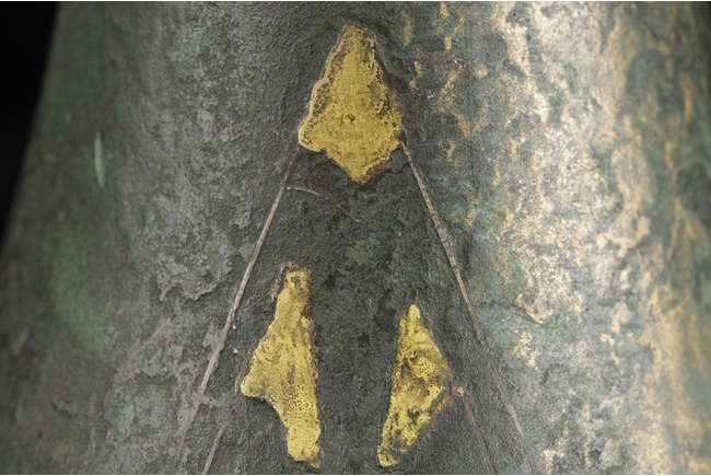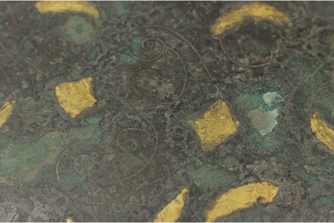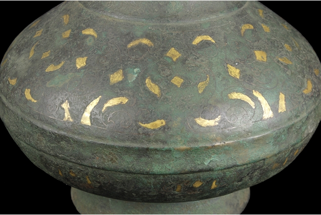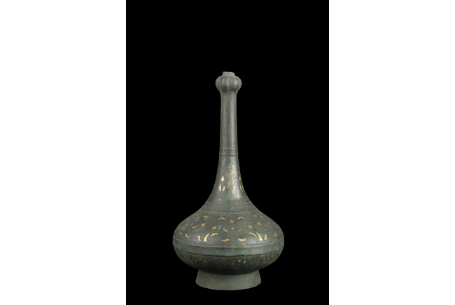 Of compressed globular form, supported by a splayed foot ring, the body decorated with splashes of gold and circular patterns, extends to a thin long neck of similar design, surmounted by garlic form top. Han Dynasty period.
