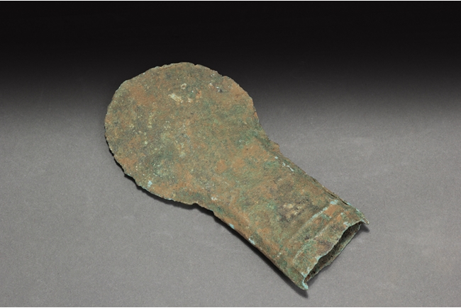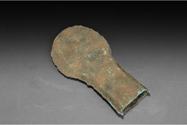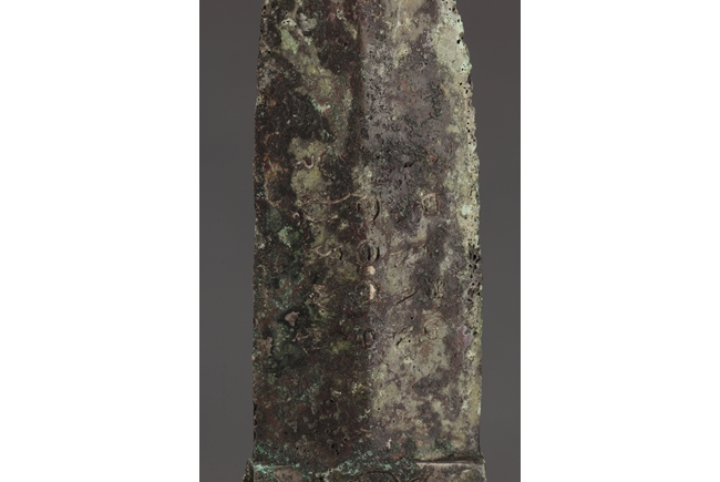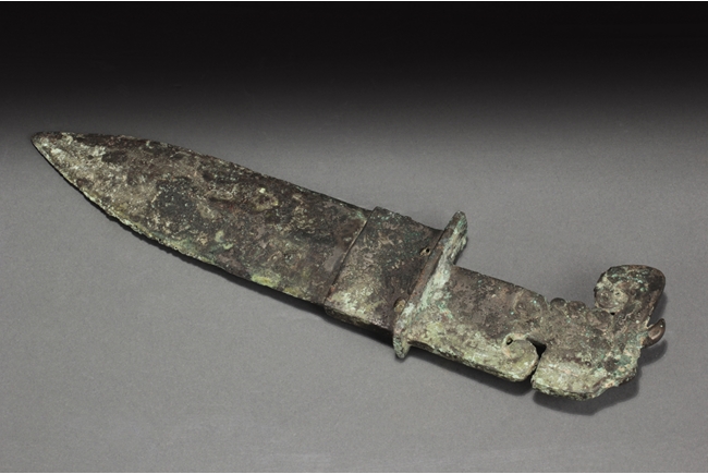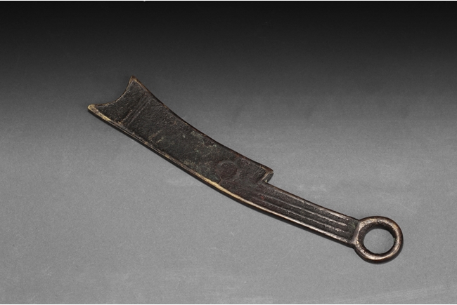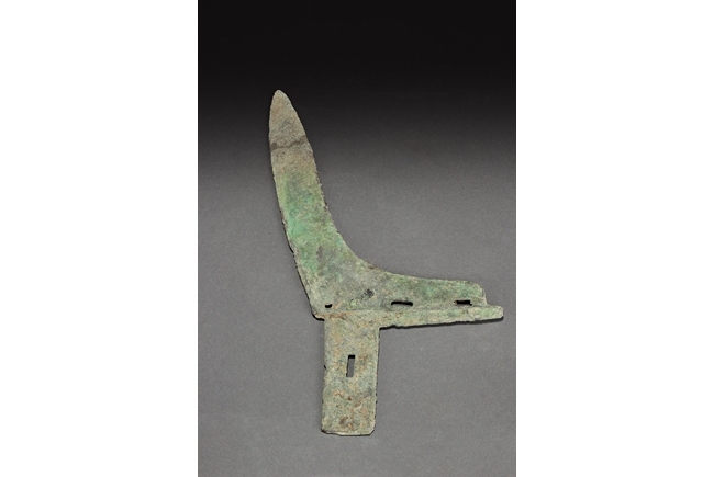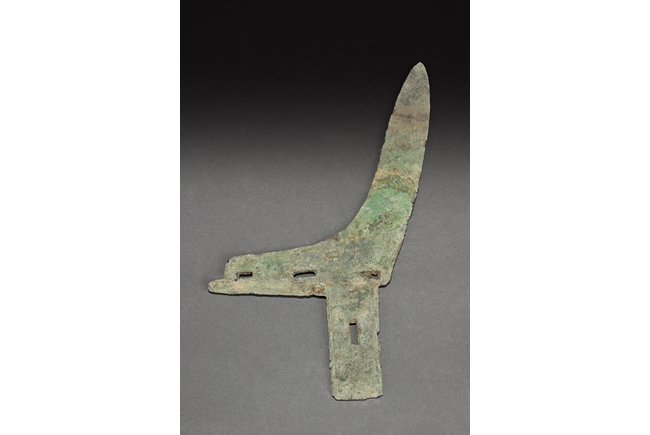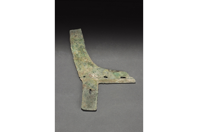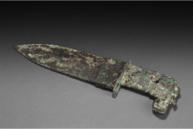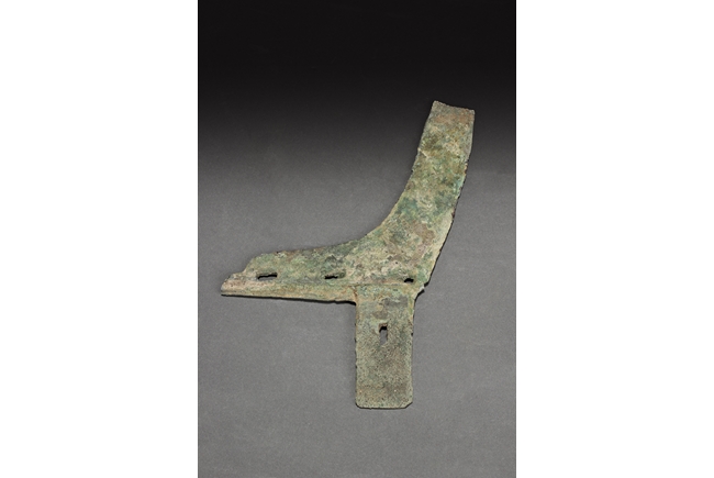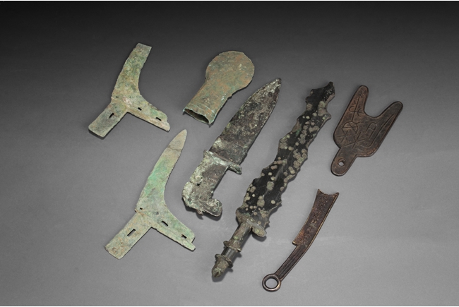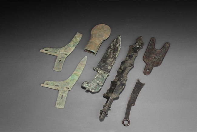 The group includes two archaic bronze L-shaped spear tip, a round tip enclosure, a dagger-like blade, a snake-shaped weapon, a spade-shaped money, and a knife-shaped money. Age related oxidation and rust. Han Dynasty period.