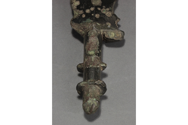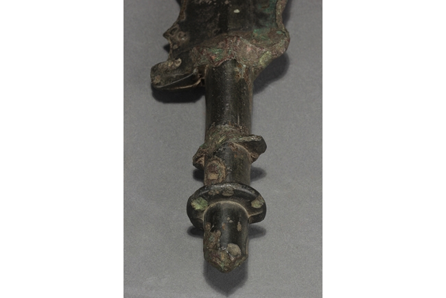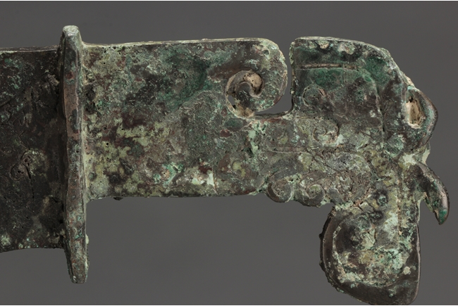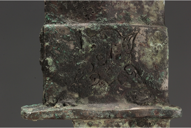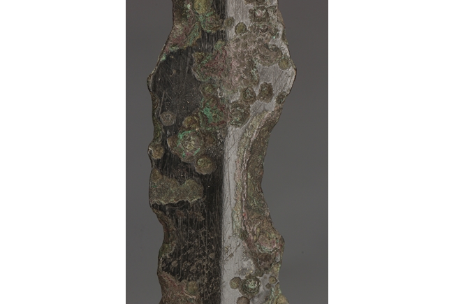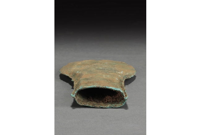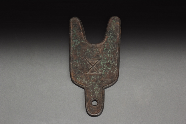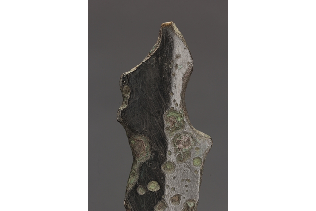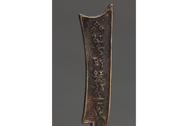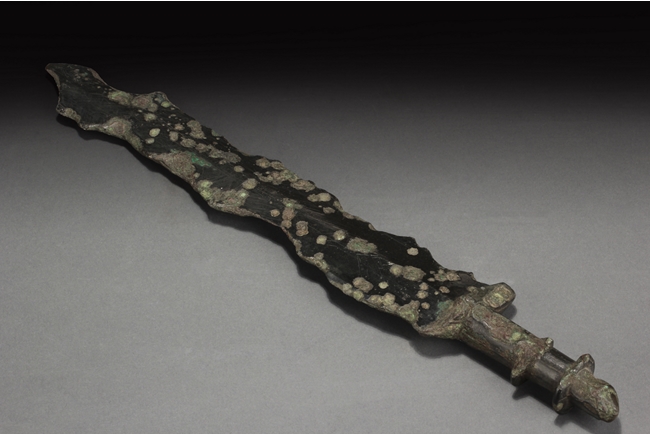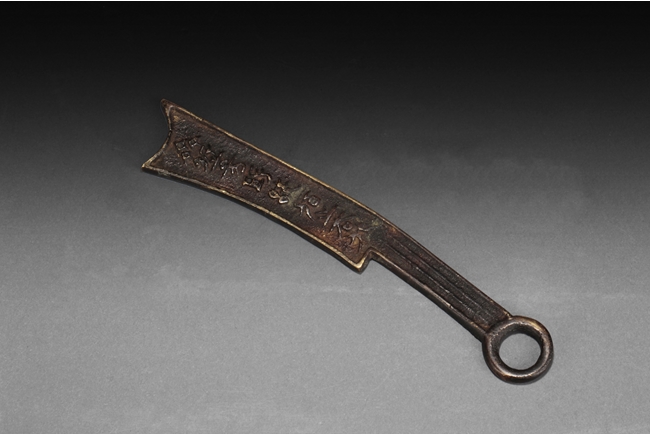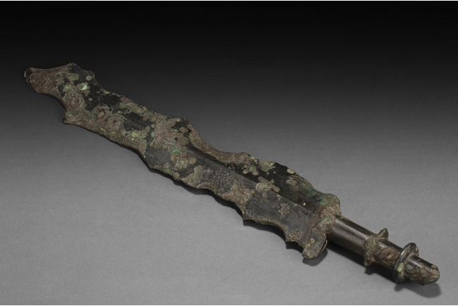 The group includes two archaic bronze L-shaped spear tip, a round tip enclosure, a dagger-like blade, a snake-shaped weapon, a spade-shaped money, and a knife-shaped money. Age related oxidation and rust. Han Dynasty period.