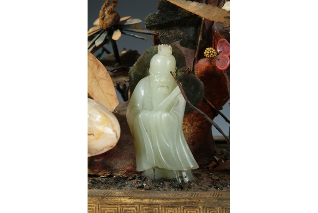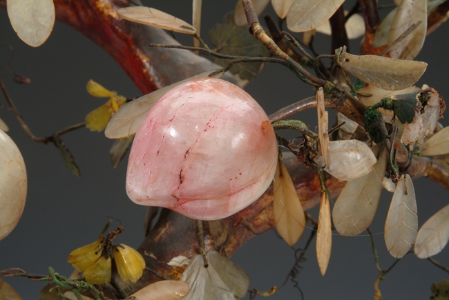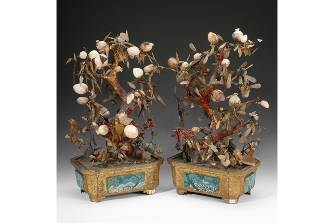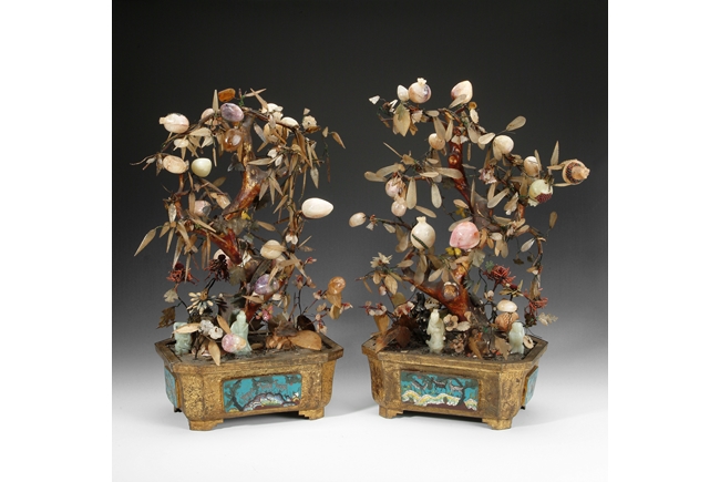 Each fruiting and flowering tree issuing from a rectangular gilt-metal jardiniere with canted corners, raised on four bracket feet, decorated with scrolling foliage, the front and back set with cloisonne panels featuring three sheep, the narrow sides set with panels depicting flowers, one tree laden with pomegranates, some highlighted with hardstone seeds, the other with peaches, their trunks entwined with a flowering vine and surrounded by flowering plants, and small images of sages and theirattendants. Qing Dynasty period.