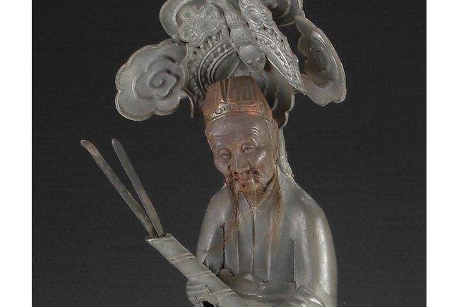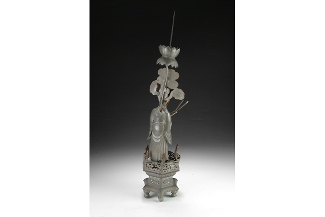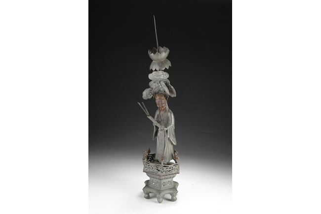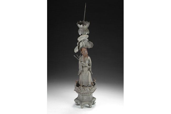 This candlestick holder is composed of a lotus pad, clouds and butterfly, a Chinese Taoist Deity and a stage-like platform. Entire candlestick holder is made of pewter, except the Deity's head, which is carved of wood. Qing Dynasty period.