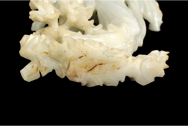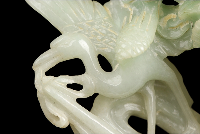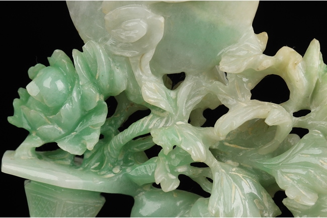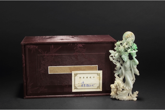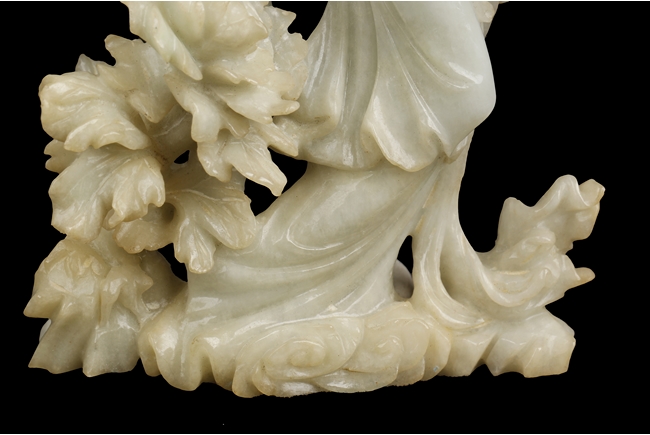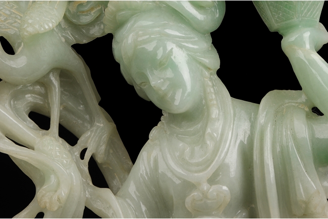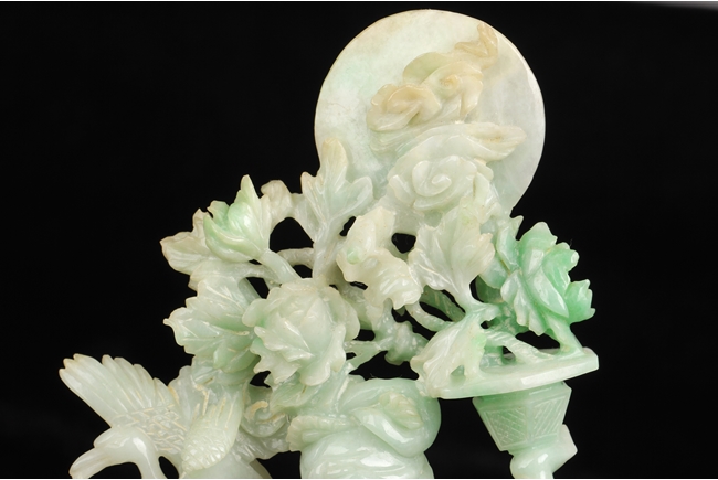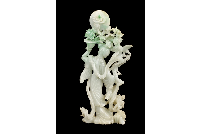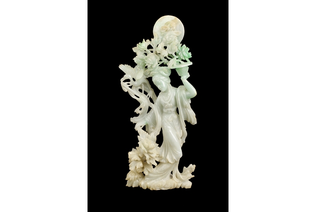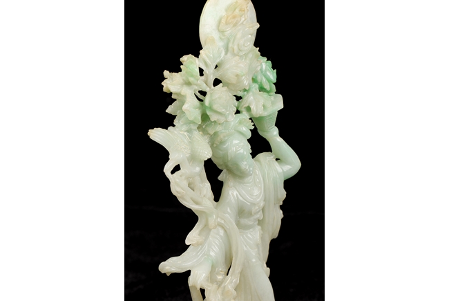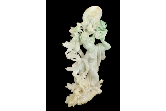 The figural group depicts a beauty holding flower basket in her left hand, right hand hangs slight to touch the flowers on the ground, with a flying crane next to her, beaks holding a wavy robe strand, all below a round moon. The stone of apple green and white color, with the patches of green color mostly on top. Qing Dynasty period.