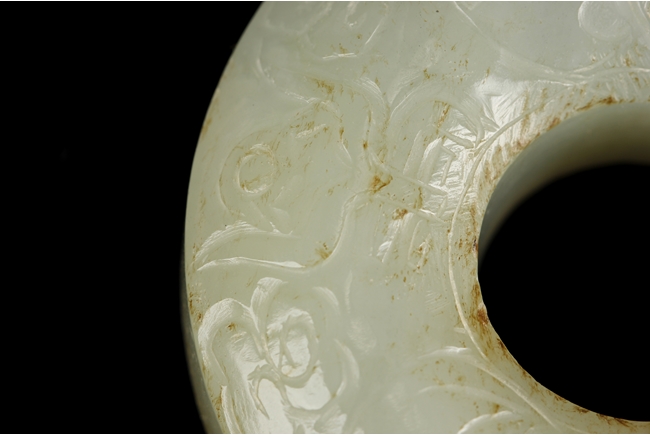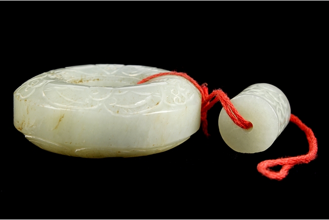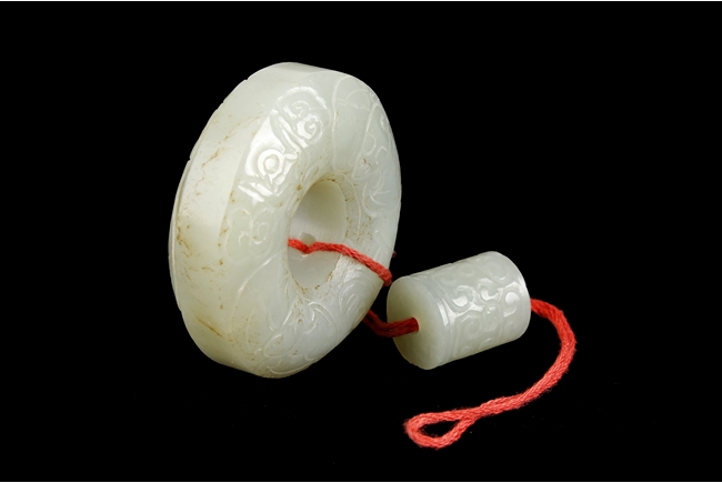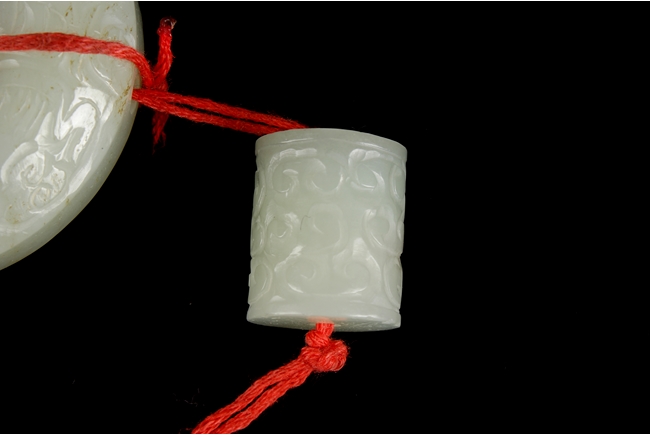 The larger jade ornament carved with dragon and cloud patterns on both sides, with a red string attached to the smaller jade ornament, carved with scrolling C patterns; stones of pale white color. Qing Dynasty period.