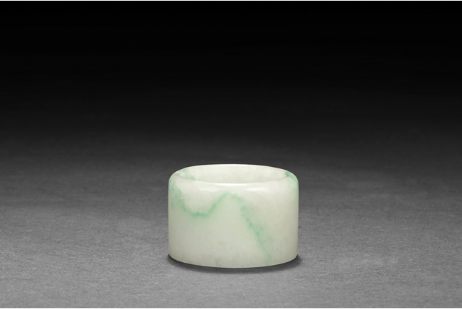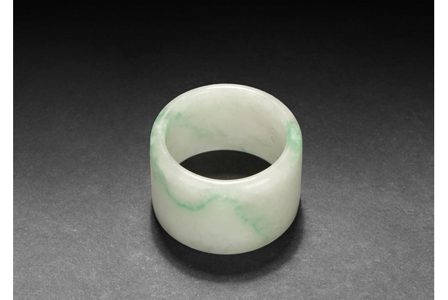 Of cylindrical form, the thumb ring with rounded edges, the stone of pale white color with patches of apple green color. Qing Dynasty period.