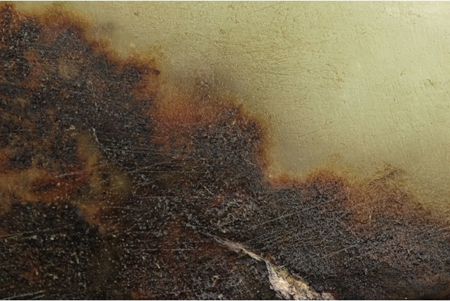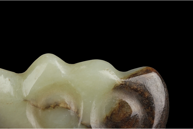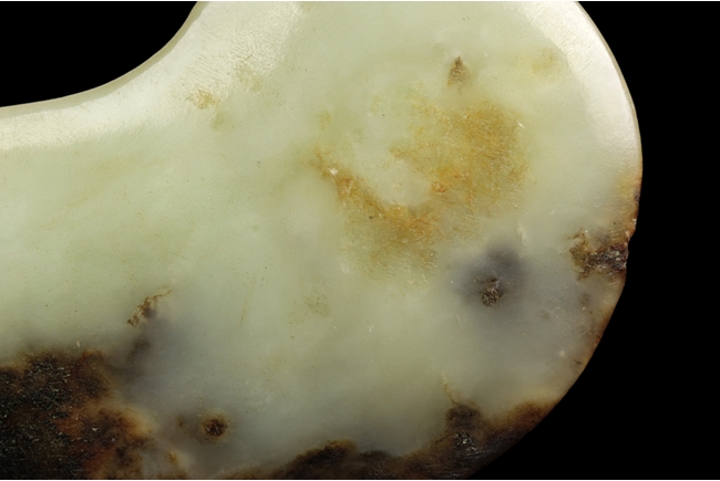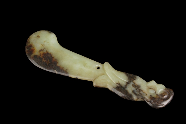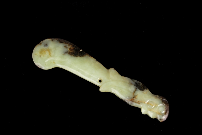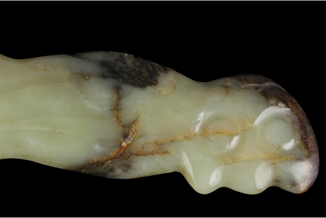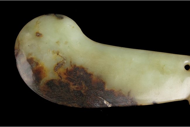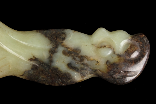 The jade carved in shape of Chinese halberd's head, complete with carved tassel and stringing hole. The stone of celadon color with patches of mottled black spread around. 19th century.