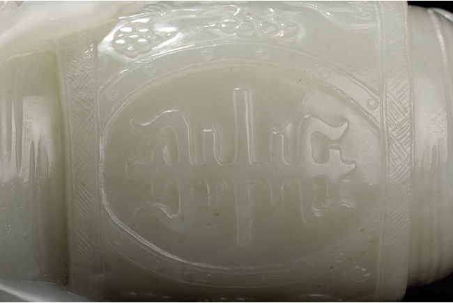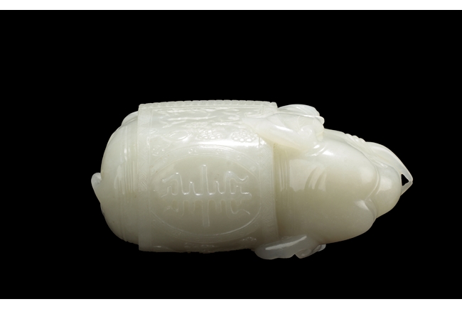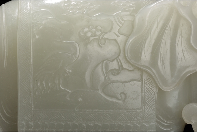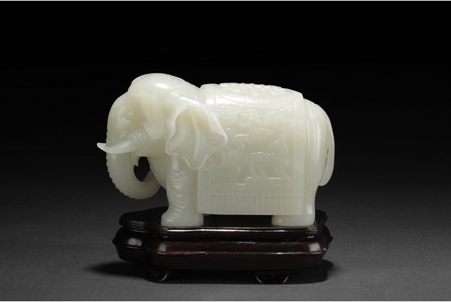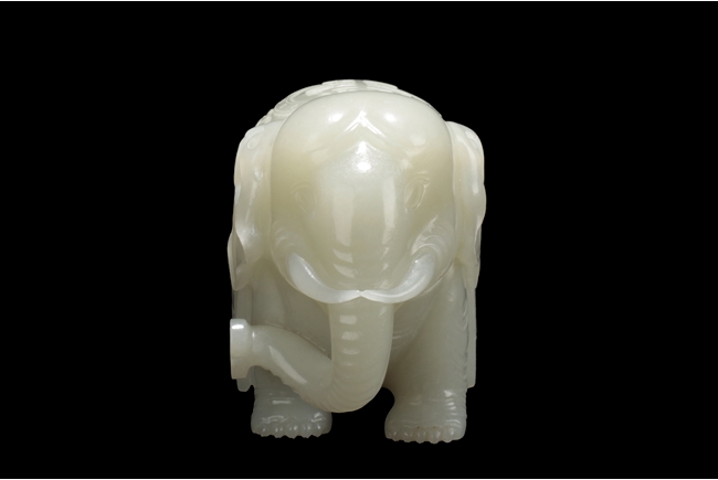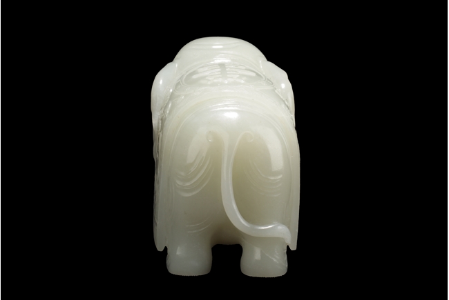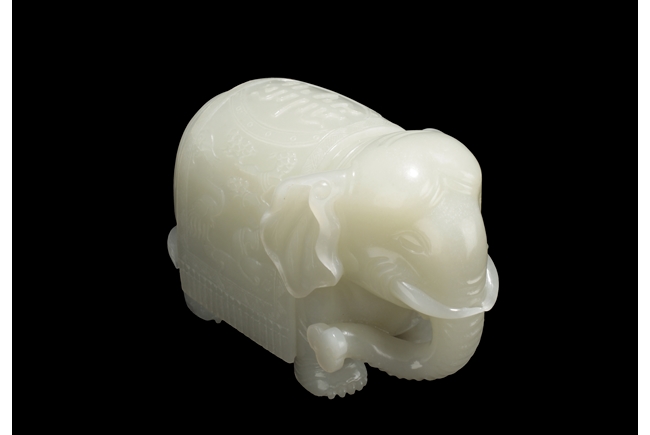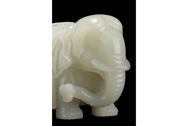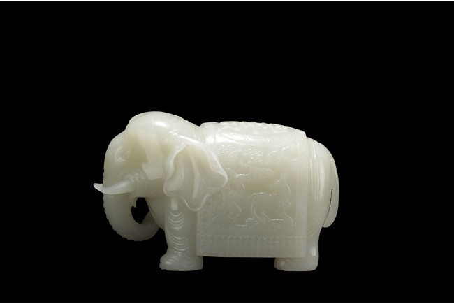 The elephant stands on four feet, the nose curled to the right, with large ears and pointy tusks, its back carries a decorated carpet, one side depicting deer within a forest, the other side depicting two cranes under pine trees, the top carved with "Shou"; the stone of alluring white color with translucency. 19th century.