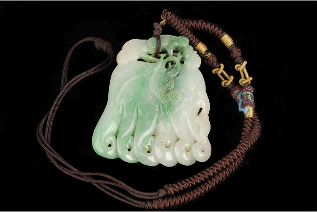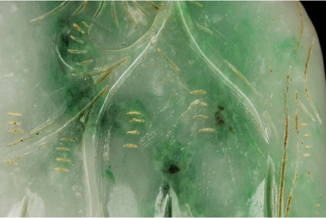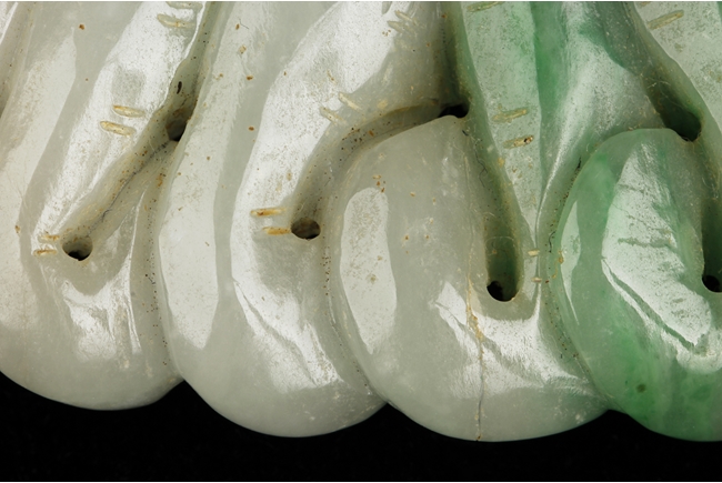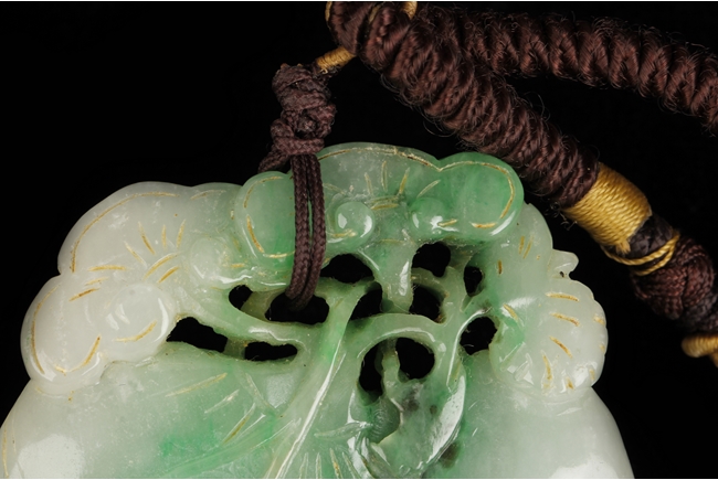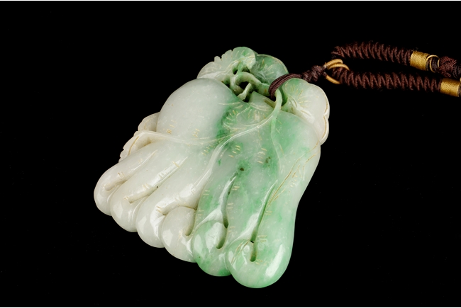 The ornament depicts a Buddha's Hand fruit, or finger citron, including its leaves and roots. The stone of white and apple green. Qing Dynasty period.