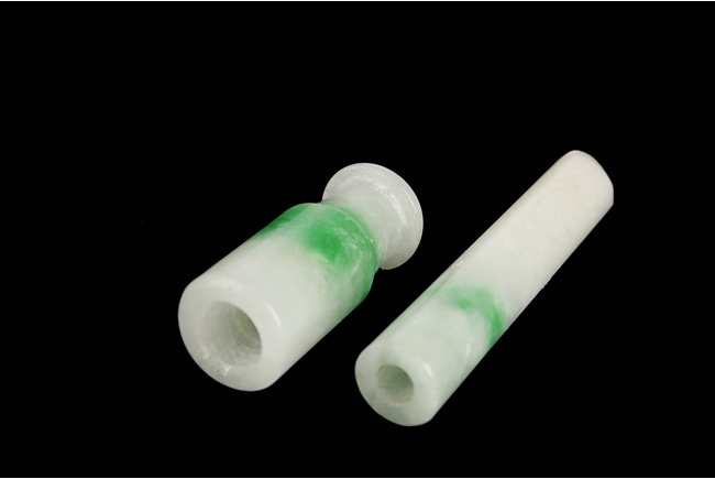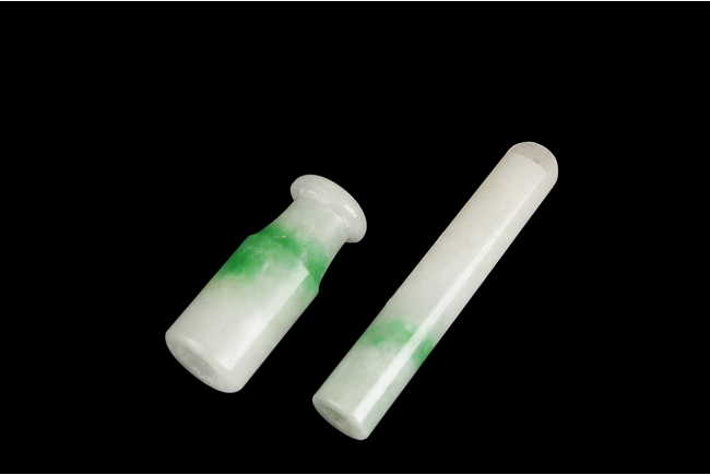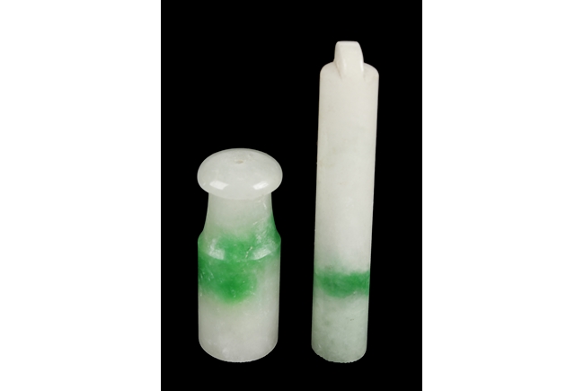 Both cigarette holders of cylindrical form, the stone of translucent white and patches of apple green. The wider cigarette holder hollowed on one end and a smaller hole on the other end. The longer one hollowed on one end and a stub on the other end. Qing Dynasty period.