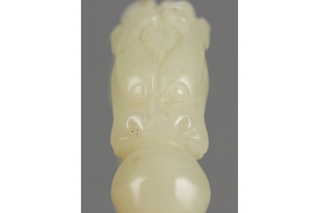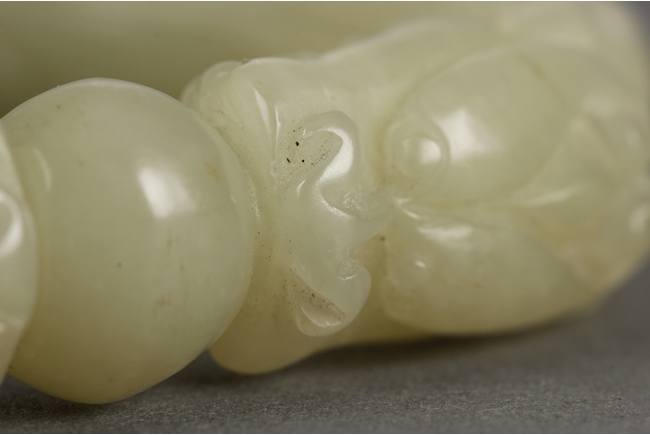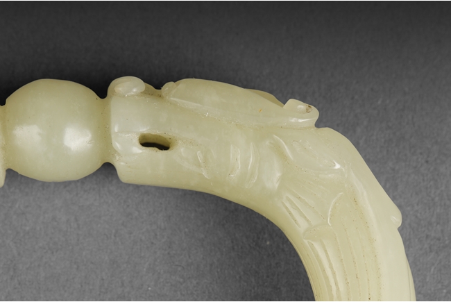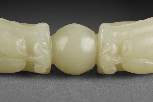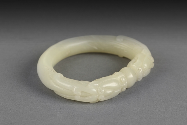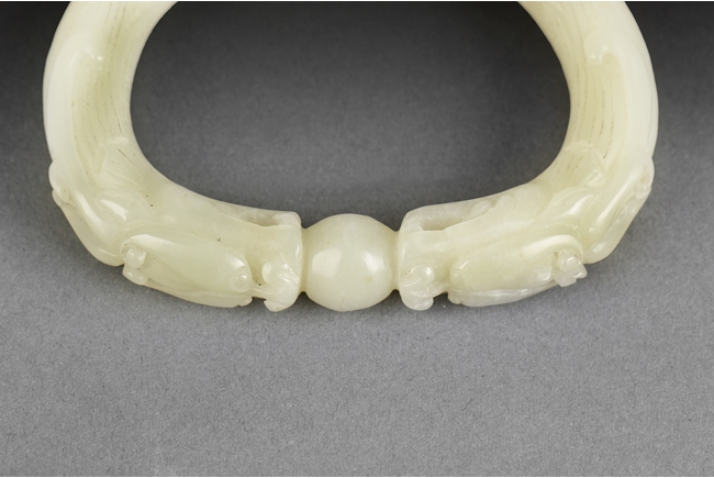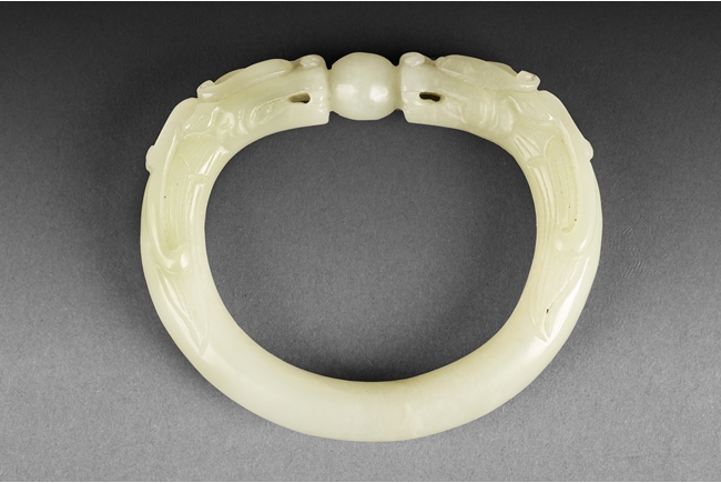 The bangle carved to depict two dragons, linked together at the tail, confronting each other with a flaming pearl in the center; the stone of celadon white color. Early 19th century.