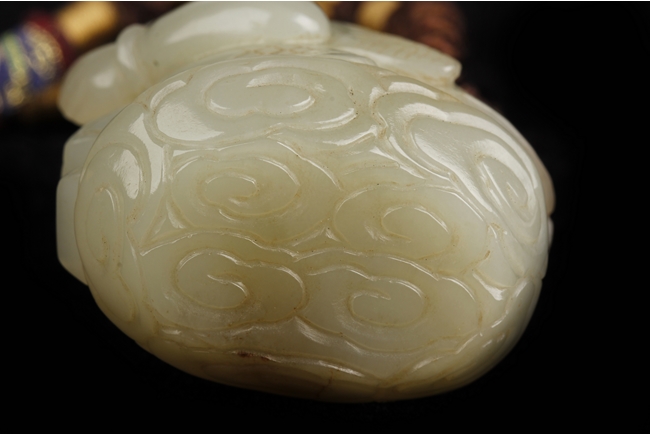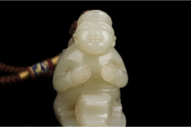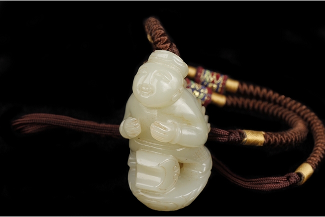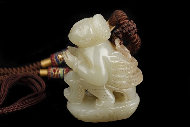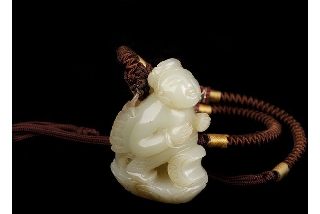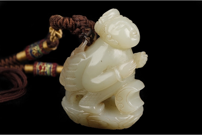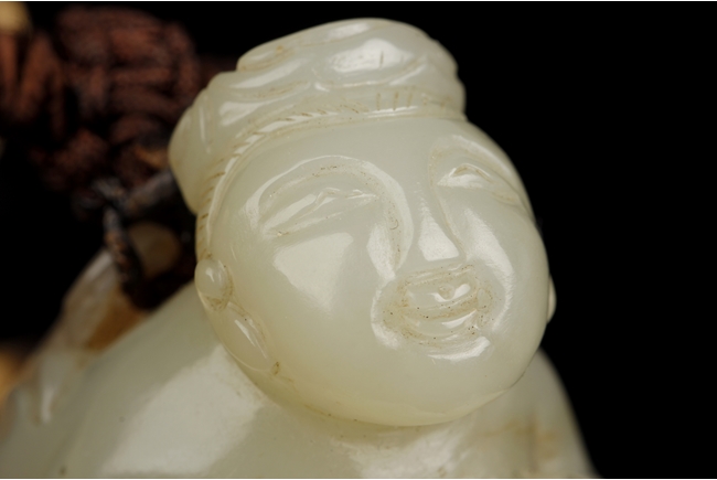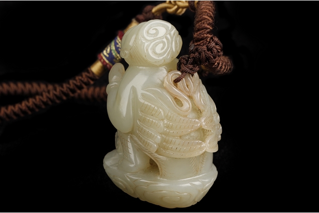The figure depicts a man flying on top of clouds with a pair of wings, next to the half moon, looking upwards; the stone of celadon white color. Qing Dynasty period.