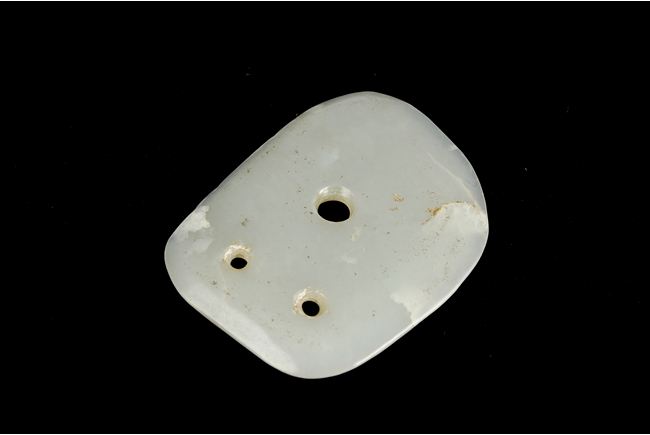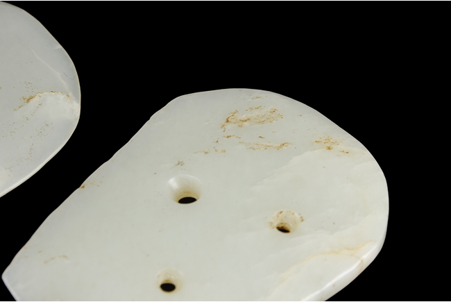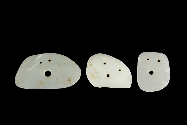 Each white jade shaped irregularly, with two smaller hole and one large hole in the center in triangular shape; the stone of translucent white color, with a little russet. Ming Dynasty period.