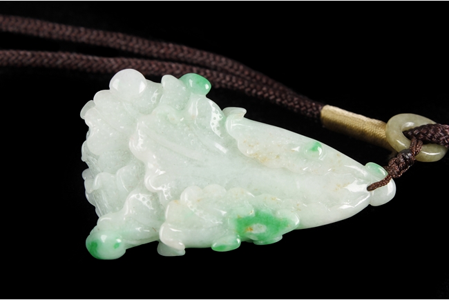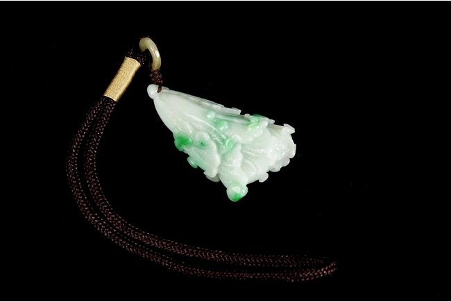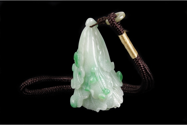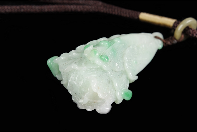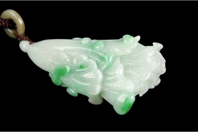 The pendant delicately carved in the form of a lettuce, showing details on every leaf; the stone of translucent white and apple green color. Attached is a string and a smaller celadon jade ring. 19th century.