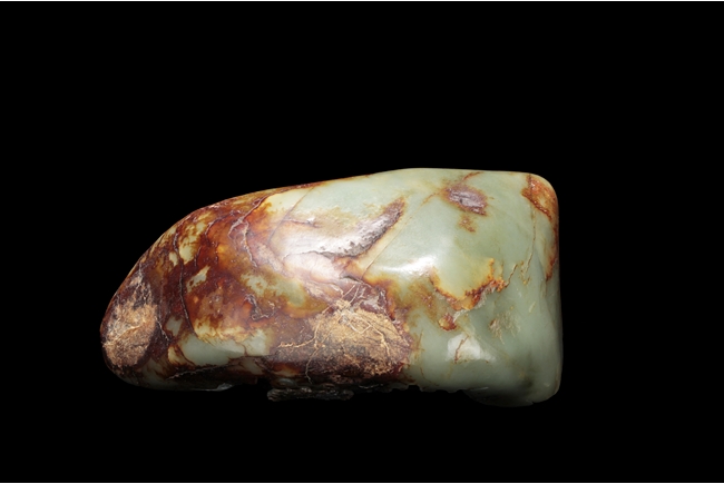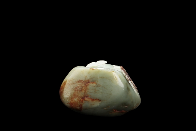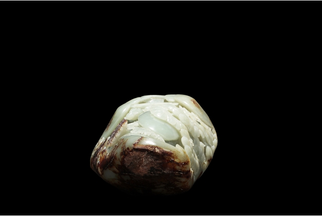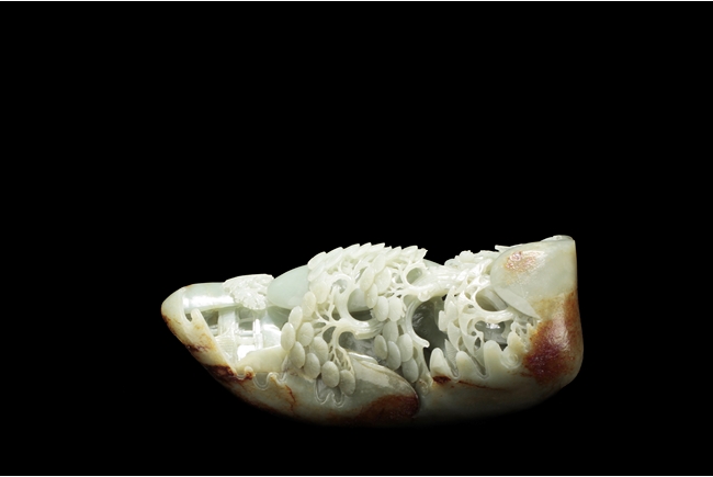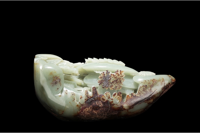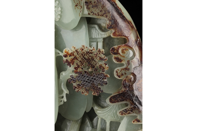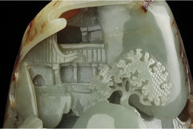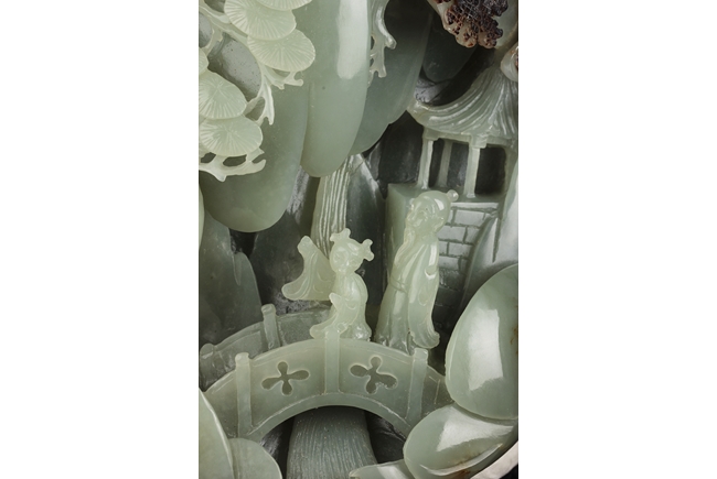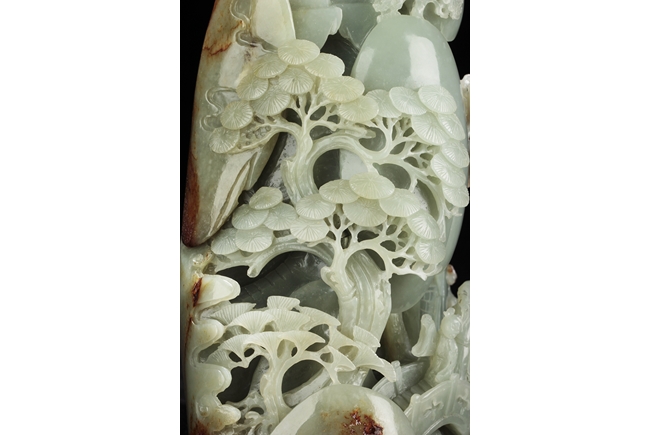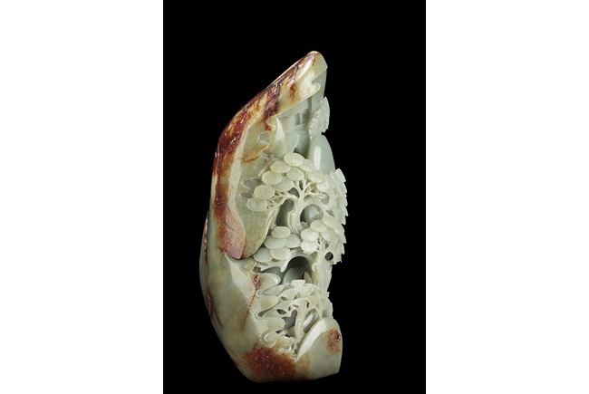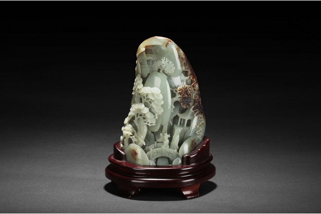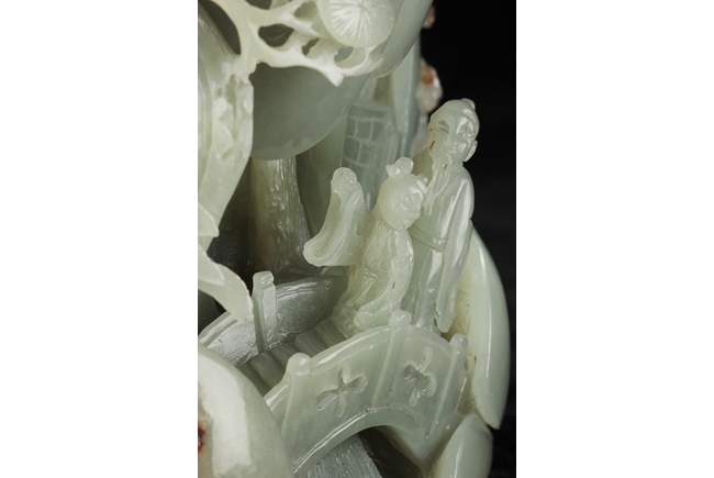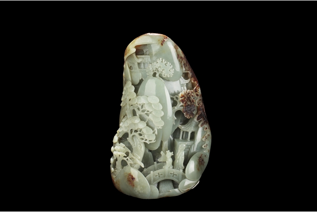 The boulder of pear form, high relief carved with a mountainous scene, depicting an elder and a child walking across bridge into the mountains to visit friends, with dense pine trees, hidden pavillions, and flowing clouds in the background; stone of celadon color with russet. 19th century.