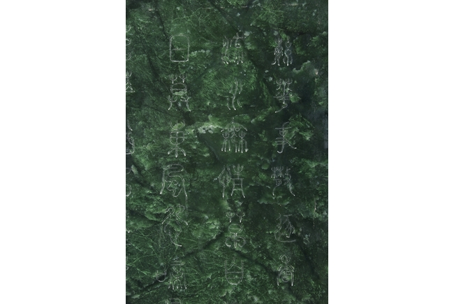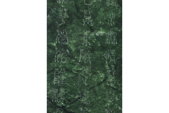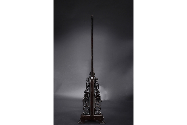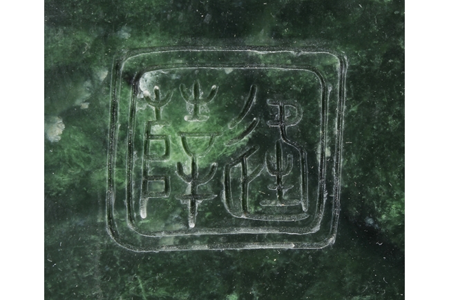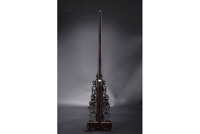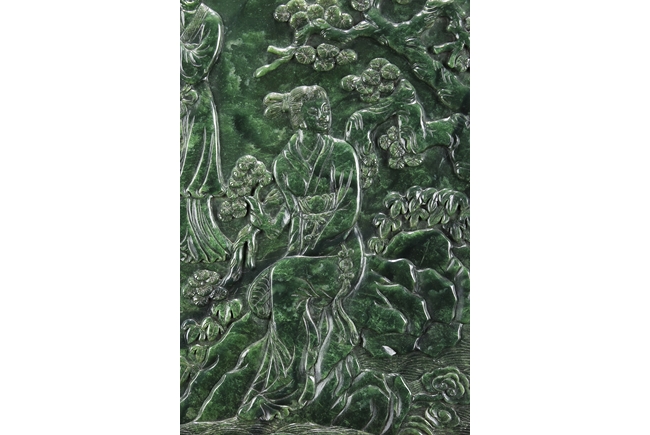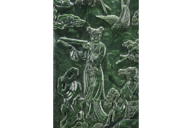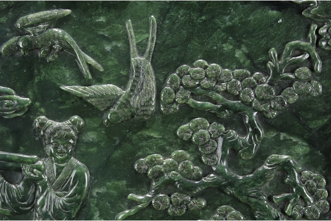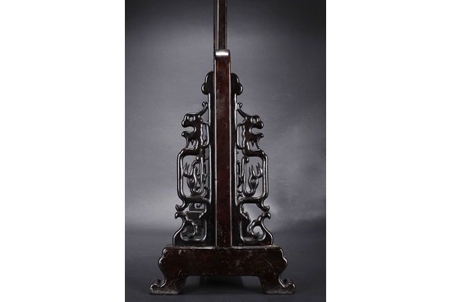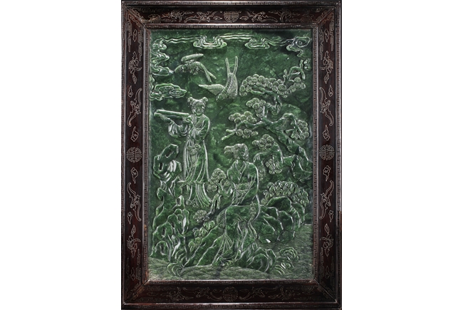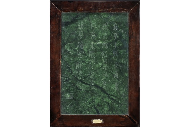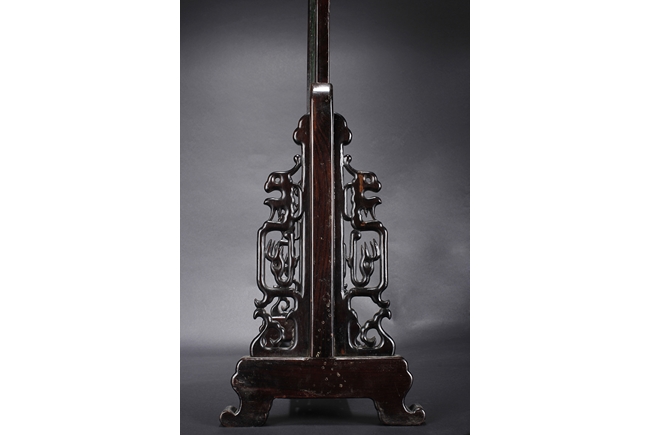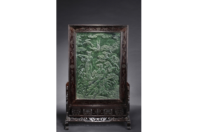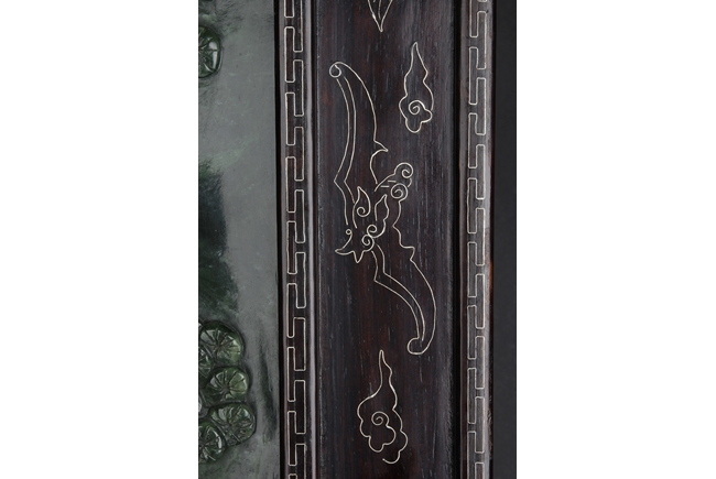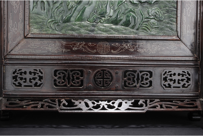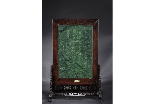 The jade plaque of rectangular form, the front side relief carved with a garden scene, wi a lady and her attendant in the center, next to rockwork and pine trees, beneath two flying swallows and ruyi-shaped clouds, the reverse lightly inscribed with a Chinese poem; the stone of dark green color. The Hongmu wood frame with auspicious symbols on the side, and the stand pierce carved with myhical creature patterns. 19th century.