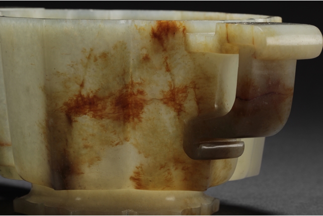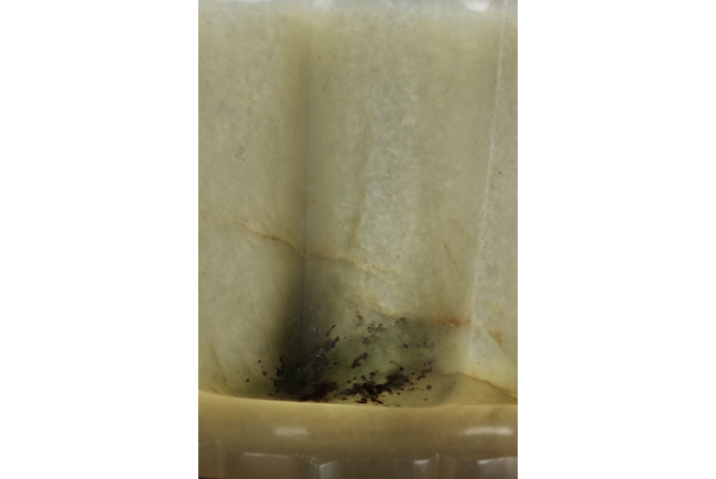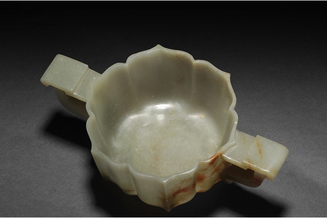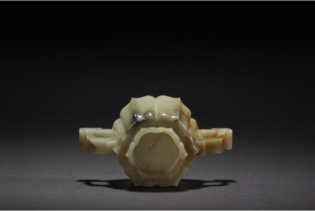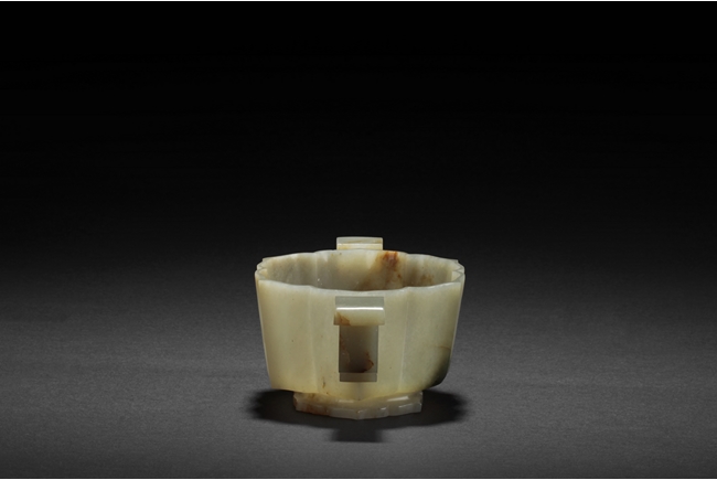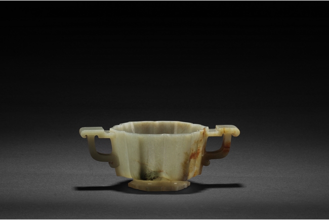 Of hexagonal floriform, the cup supported by a similar motif splay foot, the pair of handles on the side; the stone with celadon color and russet. Qing Dynasty period.