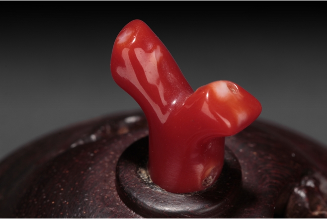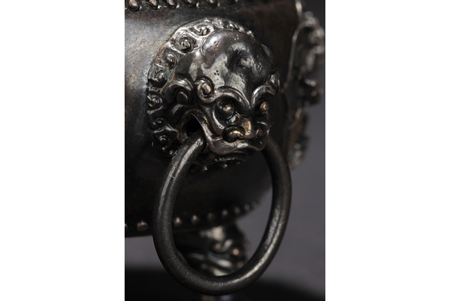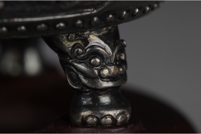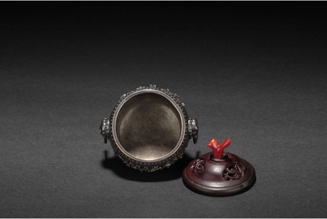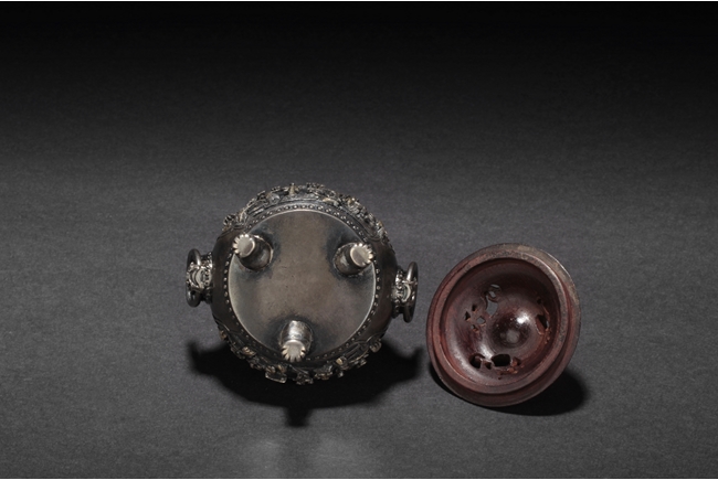Of globular drum form, the Imperial censer carved from silver, supported by three elephant legs stemming from lion masks, the body with two panels with similar motif, depicting five scholars doing recreational activities under trees in a garden or court setting, between round drum beads, a pair of lion masks extends to hanged loop ring handles, the en-suite Zitan wood lid pierce carved and decorated with a coral finial, all stands on the Zitan wood stand. Qing Dynasty period.