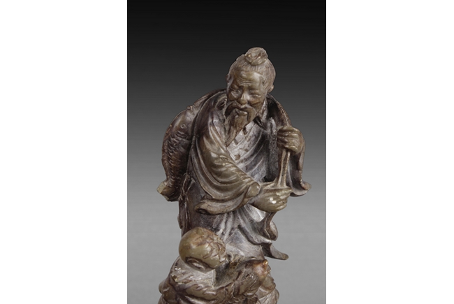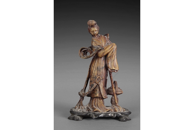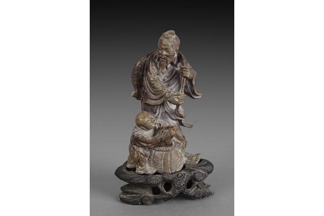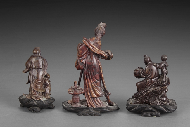 One carving depicts an elder seated and holding a basket, with two kids next to the stone, playfully approaching the elder. One carving depicts a beauty dressed in flowing robes standing next to a flower basket, while supported by a wooden plow. One carving depicts a fisherman and a young boy heading home with a basket full of fishes. Qing Dynasty period.