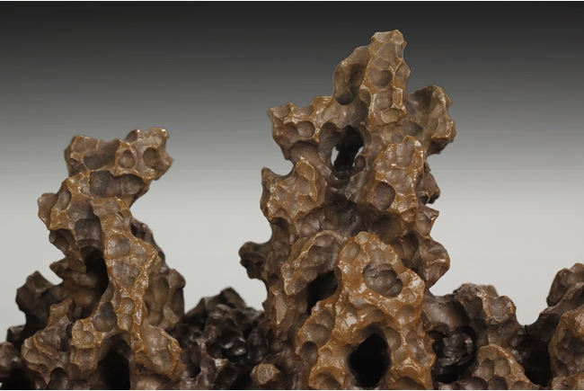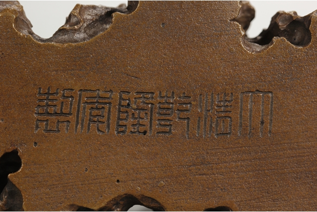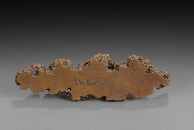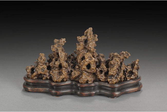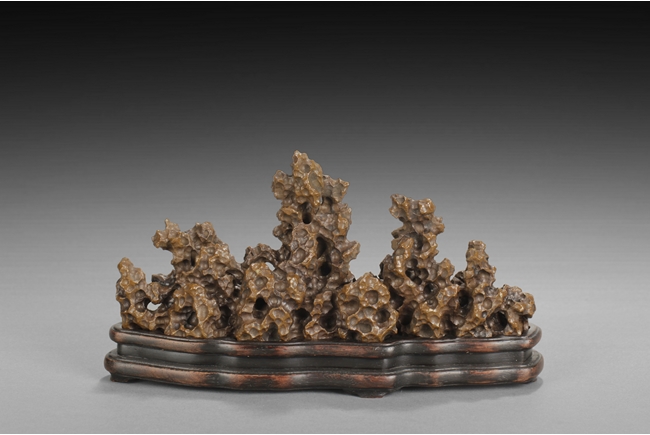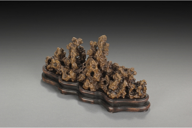 Of mountain range form, the porcelain pen rest with brown color and naturalistic colors, bottom bears six character "QIANLONG" mark, all rests on the original shaped stand.