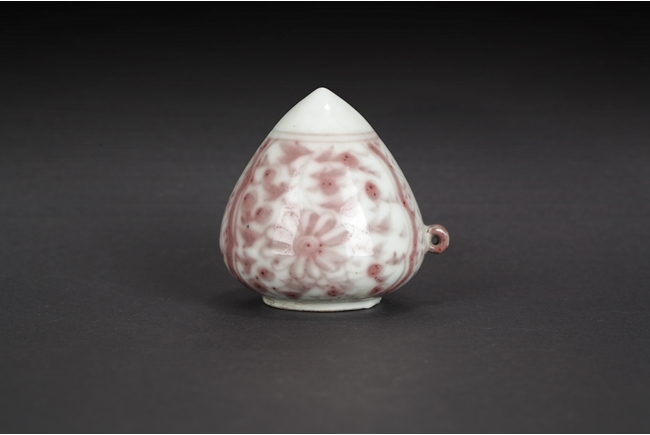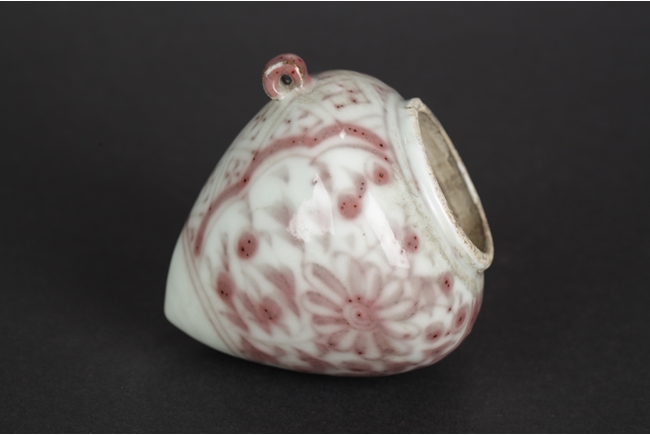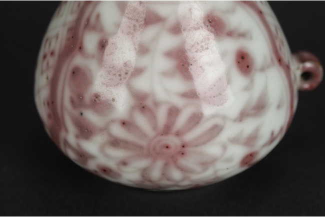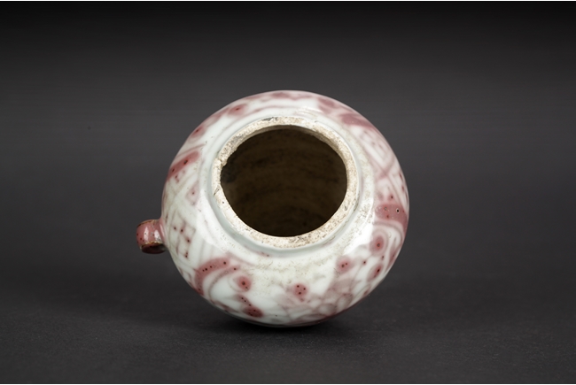Of cone form, the underglazed red exterior depicts flower and vine patterns on two sides and square patterns in-between, the side with a small loop handle. Qing Dynsaty period.