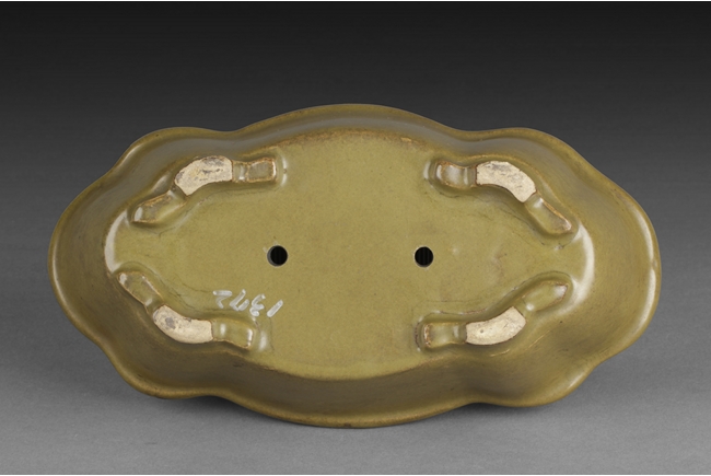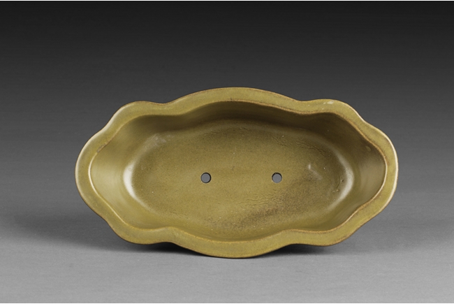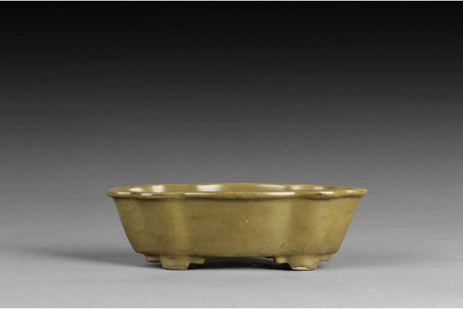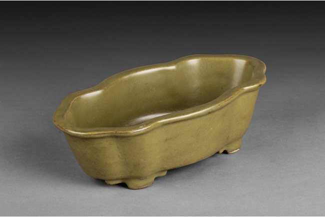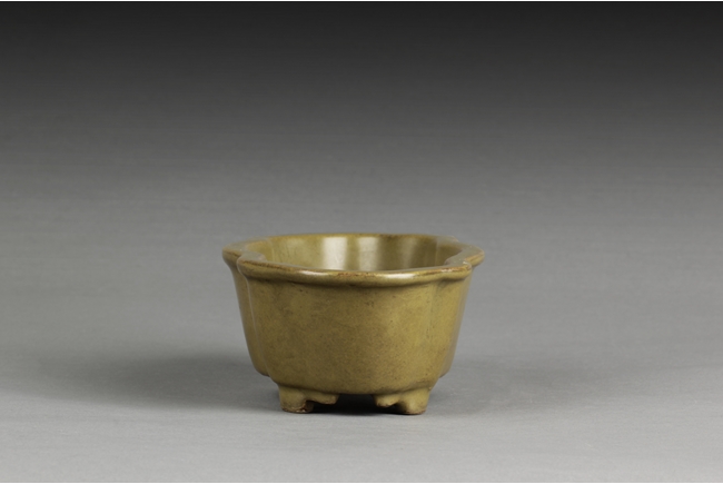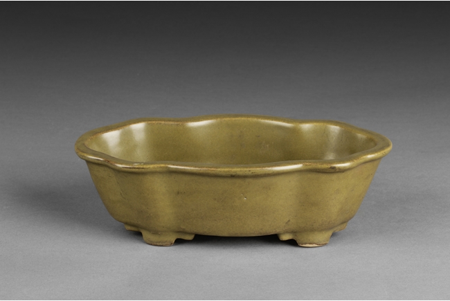 The planter supported by four short legs, rising to a lipped rim in floral shape, covered overall in teadust glaze. Qing Dynasty period. Provenance: Estate of Thomas Chang of United States