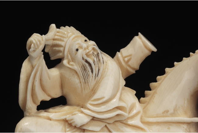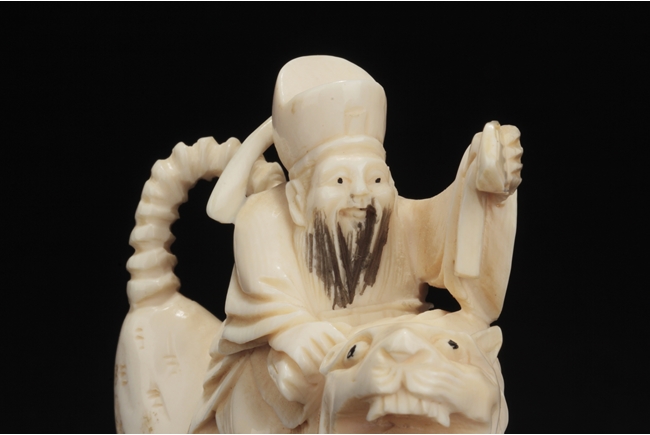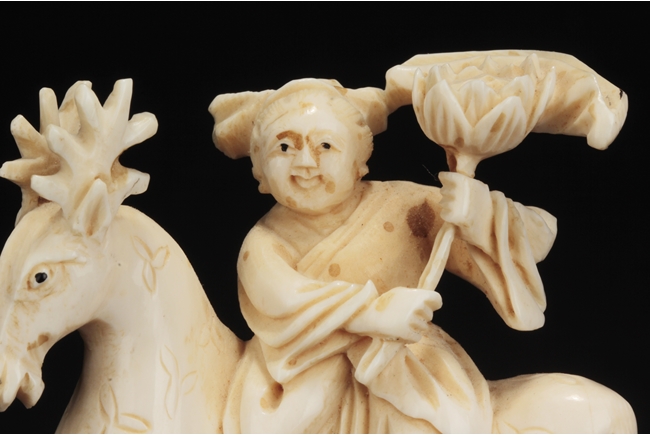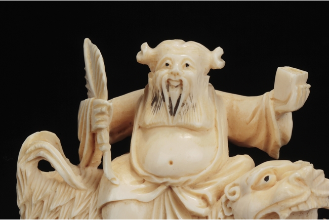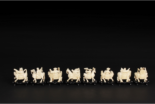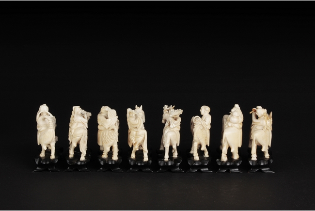 The set includes the complete Eight Immortals, each with its own ritual instrument and rides on different mounts, such as horse, qilin, buffalo, deer, elephant, and more; all with original wooden stands. 19th century.
