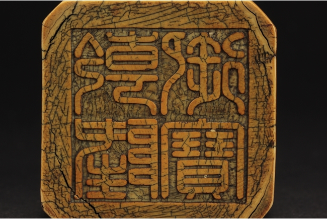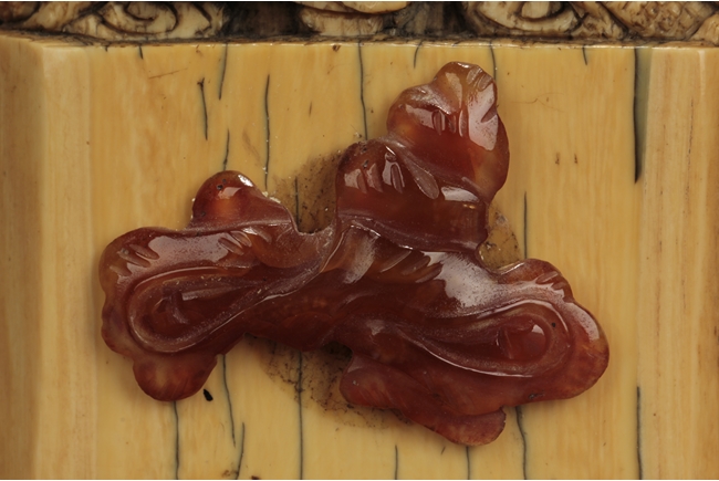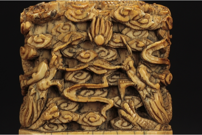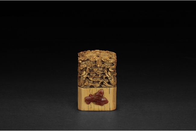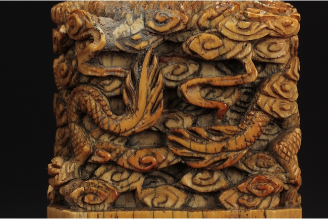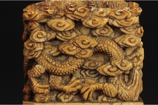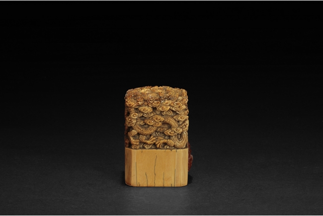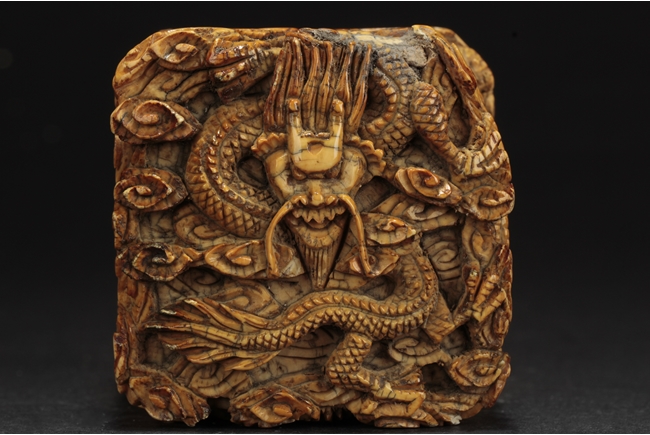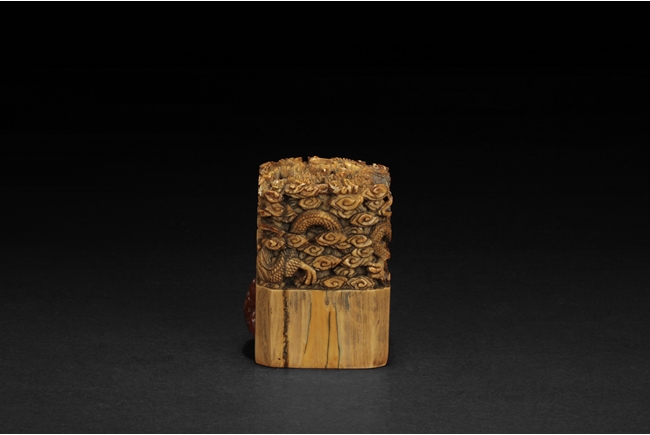 Of rectangular form with flat corners, the top carved with a dragon amidst clouds, the sides carved with two confronting dragons chasing after a flaming pearl, and the bottom with a four character mark. Age related cracks and imperfections. Qing Dynasty period.