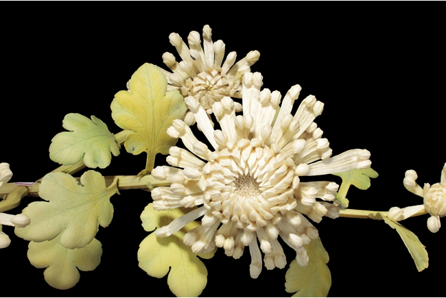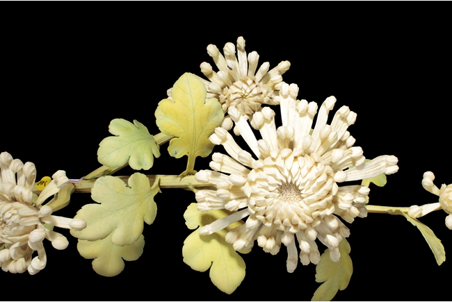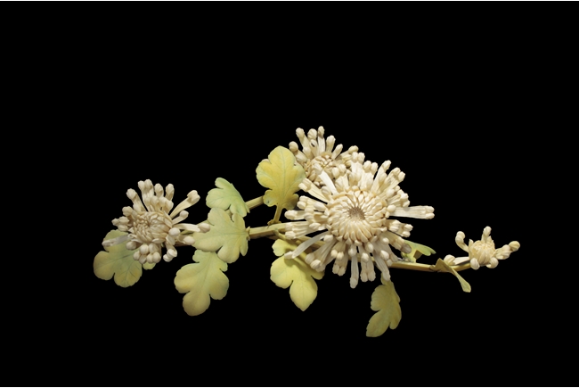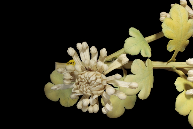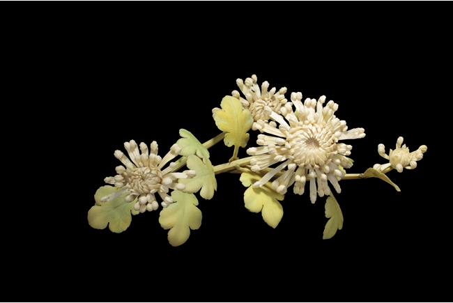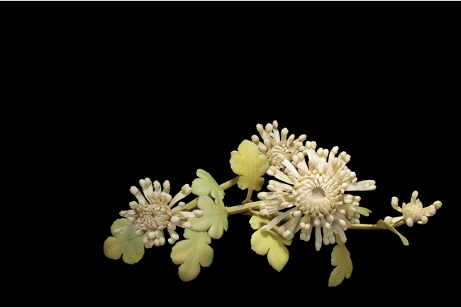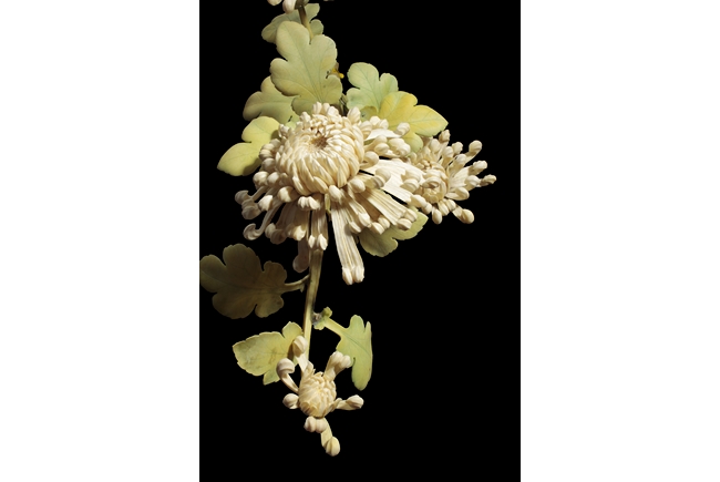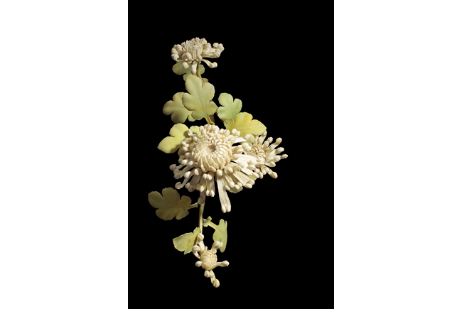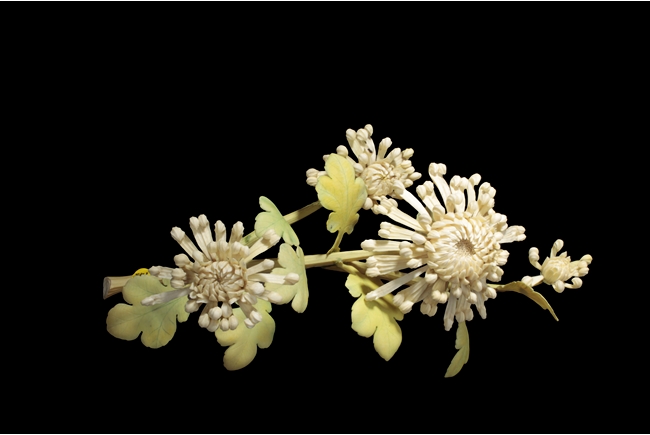The figural group depicts a branch of blossoming chrysanthemum flowers, one large flower at center, two medium flowers on the back and edge, and one small flower bulb at the end, entire figure composed and carved from ivory, the leaves and branches painted yellow-green. 19th century. Provenance: Rosily Museum of Taiwan