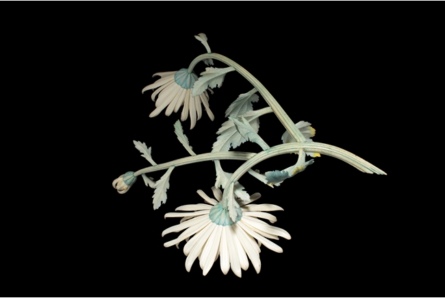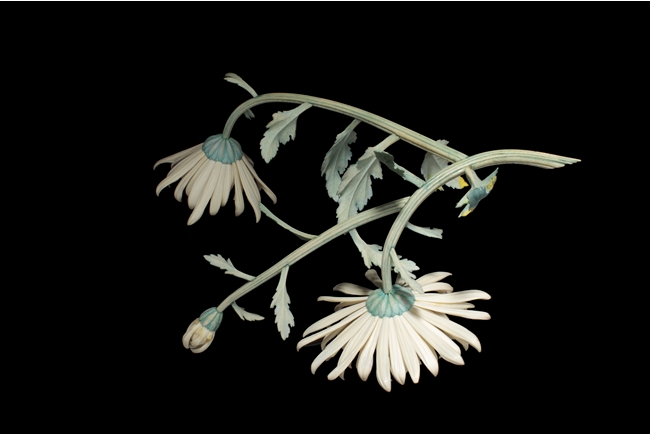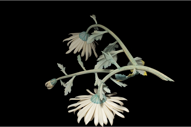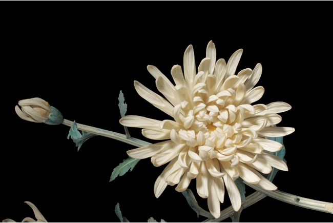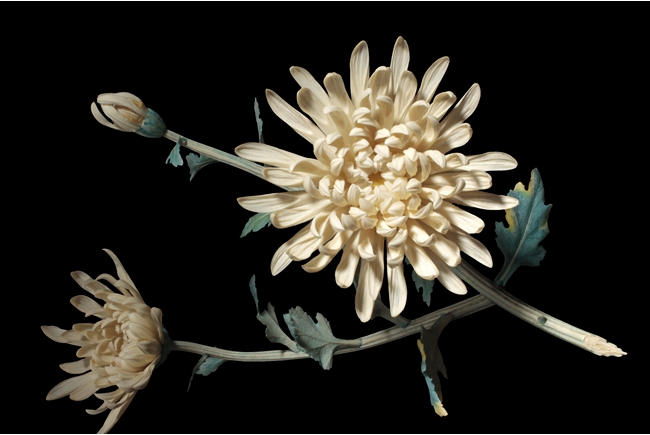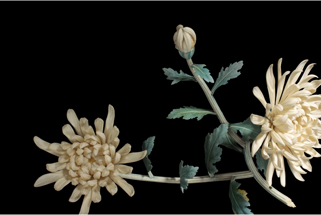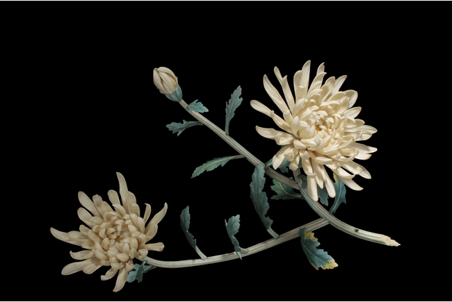 The figural group includes three chrysanthemum flowers, two fully blossomed and one still in bud form, composed completely from carved ivory, with branch and leaves painted in bluish yellow. 19th century. Provenance: Rosily Museum of Taiwan