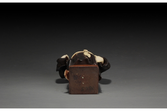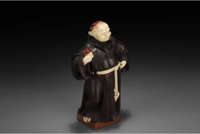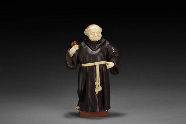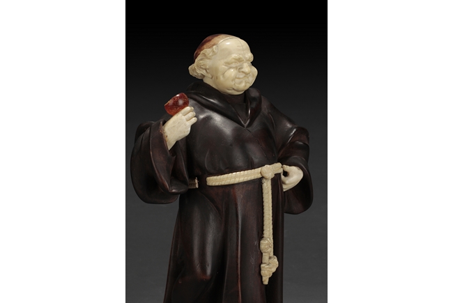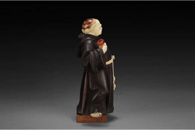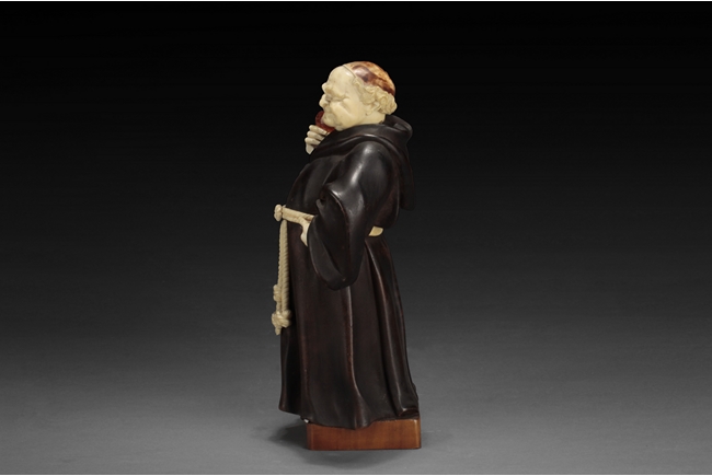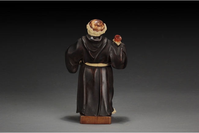 The figure depicts a Western monk in wooden robes, the head, hands, feet, and belt carved from ivory, and a chalice carved from amber.