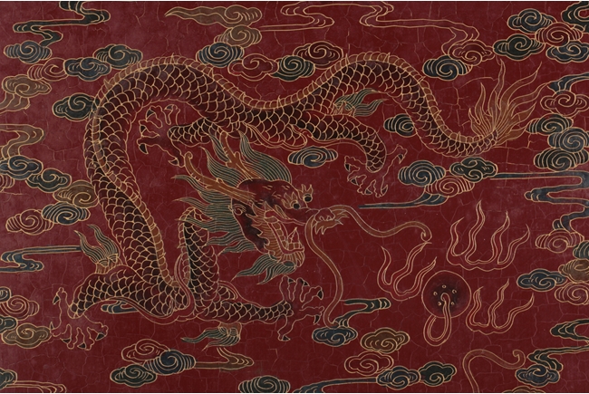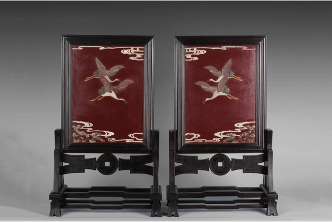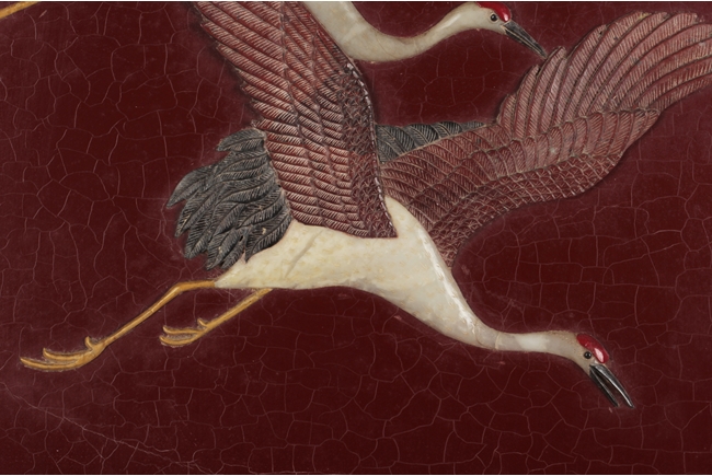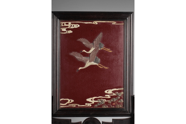 The plaque of rectangular form, the jade and other gems depicts two flying cranes high above pine tree tops, against lacquer background, the reverse depicts two five-clawed dragons chasing after a flaming pearl in the amidst clouds above the ocean. Qing Dynasty period. Provenance: Rosily Museum of Taiwan