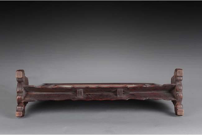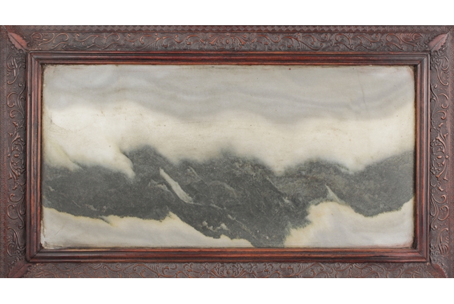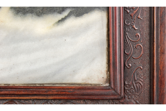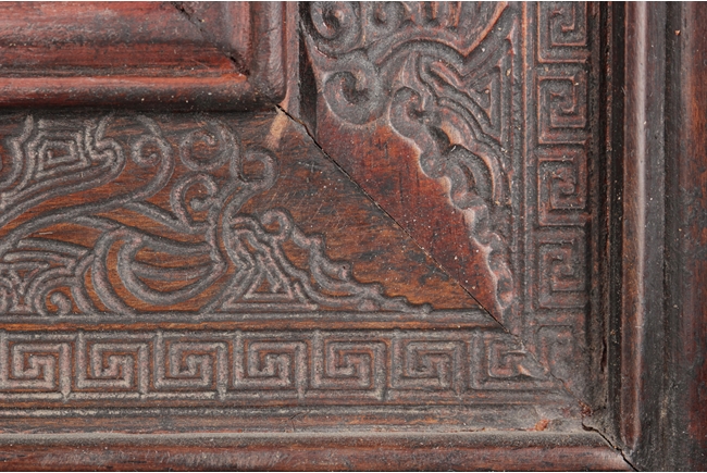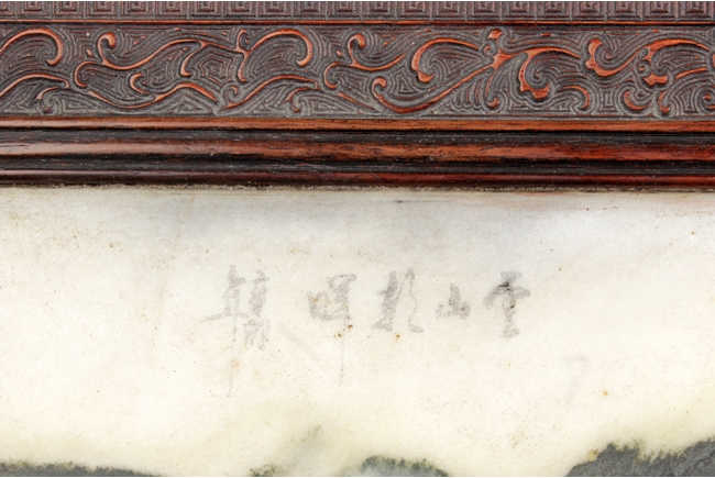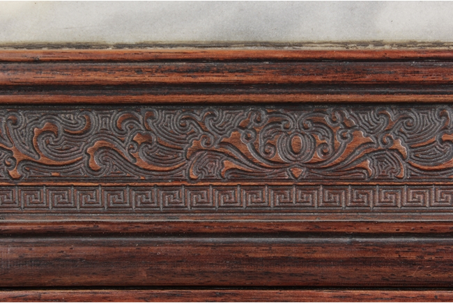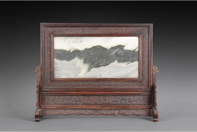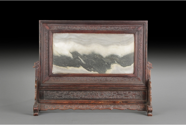 Of rectangular form, the table screen carved with Chilong, vine, flower, and key-fret patterns around the Hongmu frame, the stand, and the skirt, the plaque fitted with a natural marble slab, with five Chinese characters on the top. 19th century.