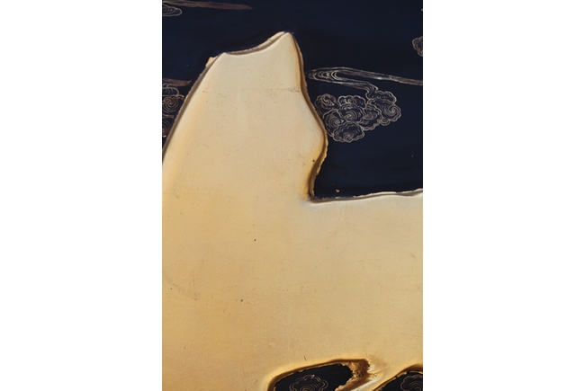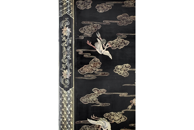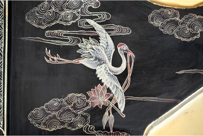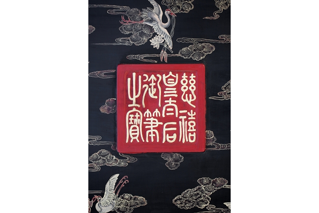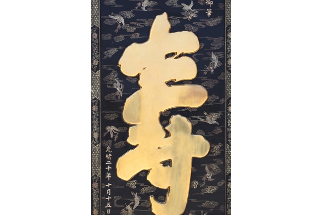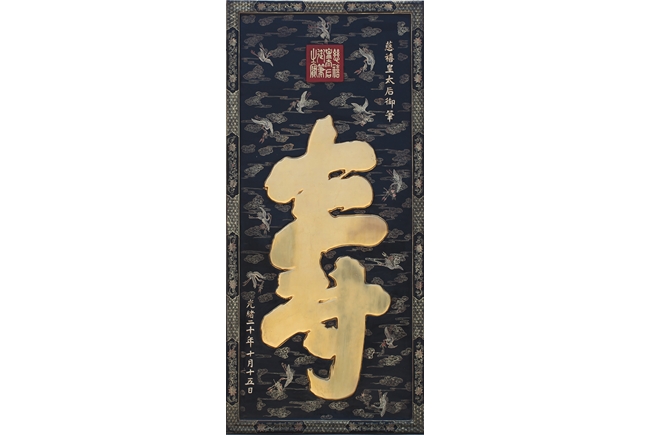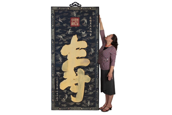 "Of rectangular form, the vertical plaque with a large gilt character 'Shou' in the center, cranes flying amidst clouds, the border with alternating peony flower and triangular patterns. The plaque with Empress Dowager Cixi's signature and seal, with date on bottom left. Due to the loss of of original gold dust, the collector has re-applied gold dust on top of the 'Shou' character in 1982.