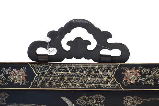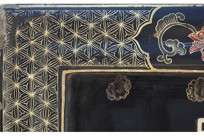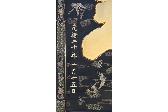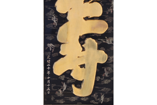 所用木料考究(很重),原裝掛鉤,描金仙鶴,完整,並刻有慈禧皇太后禦筆之寶,落款為光緒二十年十月十五日。此壽字運筆流暢自如,大方莊嚴,充分體現了慈禧太后對書法的造詣。藏者因原有金粉脫落嚴重,在1982年將壽字表面用金粉重新整理。藏著為美國醫生,不願意透露姓名。 Provenance: an American doctor.