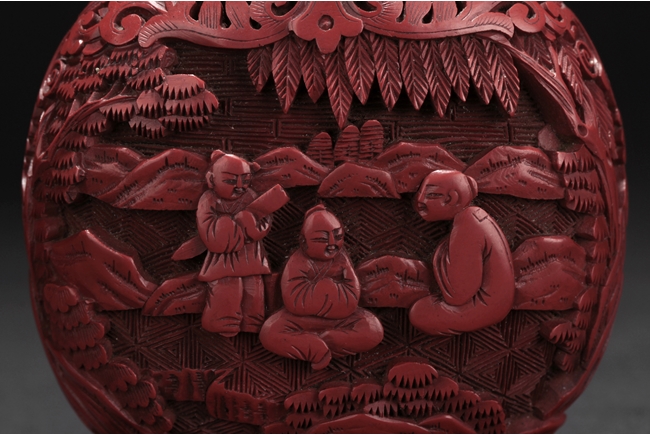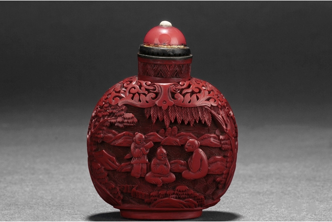 Of flattened ovoid form, the snuff bottle low relief carved with two scenes, one with three young boys gathering in a river and forest setting, other with an elder and two boys in mountain and forest setting, the top and sides carved with floral patterns. Qing Qianlong Dynasty period.