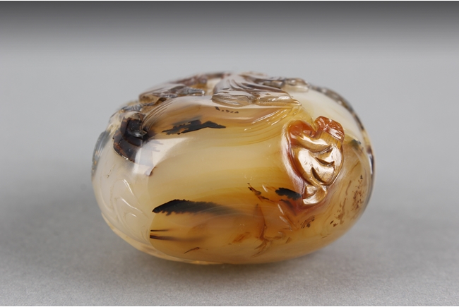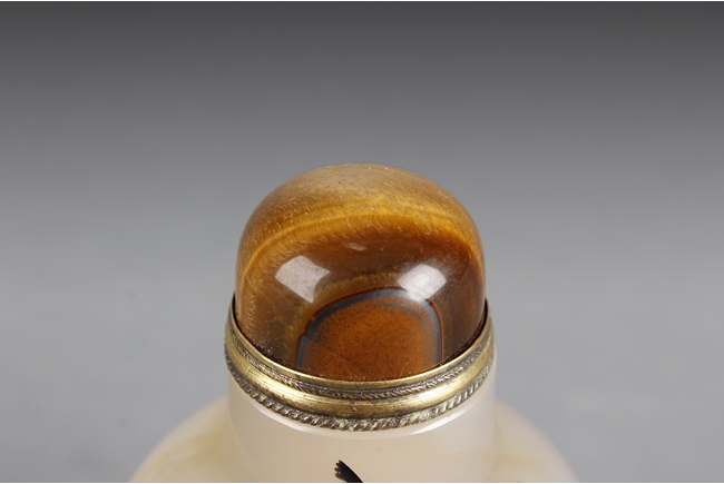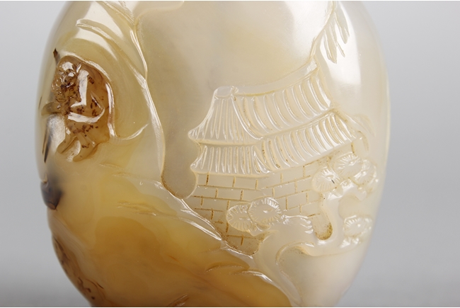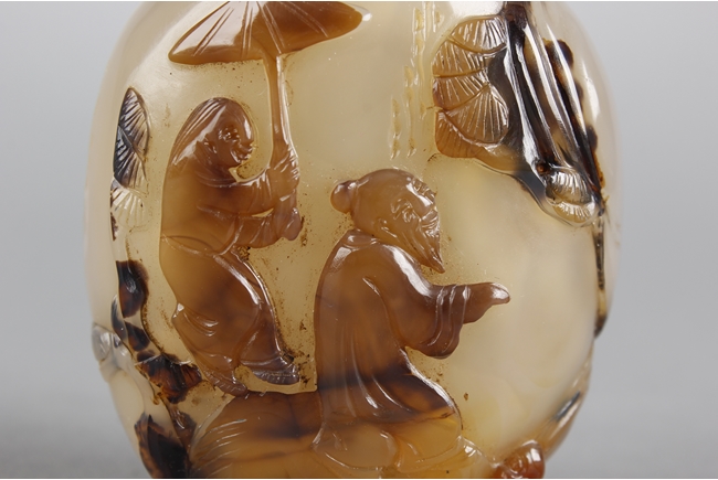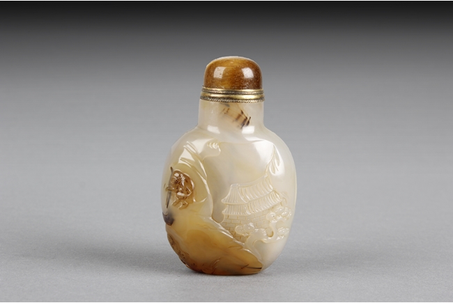 Of flattened ovoid form, the snuff bottle cleverly utilized the darker agate colors to carve a scene of an elder and an attendant within mountains, with pine trees, flowers, and buildings close by; the stone of brownish-white with graduating shades. 19th century.