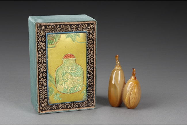 Of ovoid form, one agate snuff bottle taller than the other, both carved similar to fruit with branch-like stopper, and a banana leaf on the side; stone of brown-white color, with slight transparency. Includes snuff bottle container. Qing Dynasty period.
