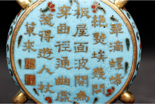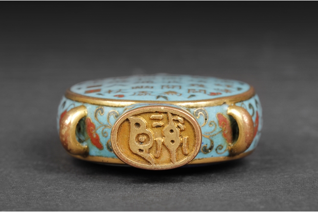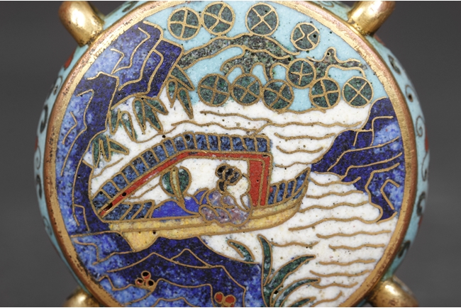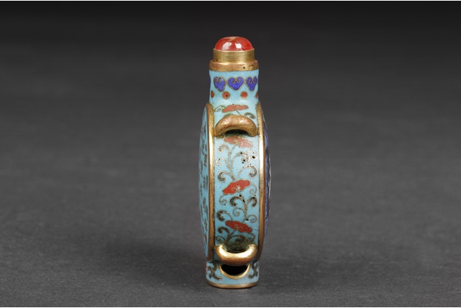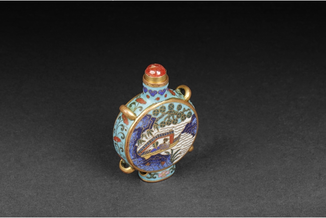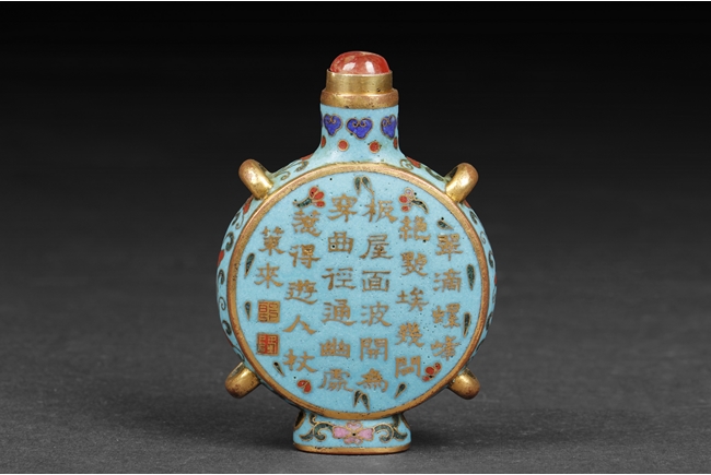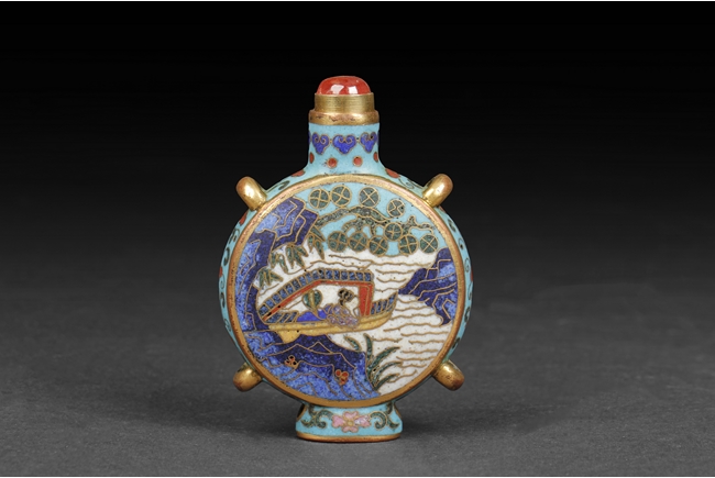 Of flattened round form, the snuff bottle supported by a splayed foot, the front enameled with a lady resting in a boat, traveling across river near mountains and trees, the back enameled with a Chinese poem and two seal marks, the sides decorated with lingzhi, ruyi, and flower patterns, with four arching handles attached. Bottom bears imprinted mark. 19th century.