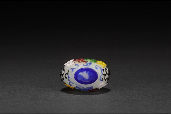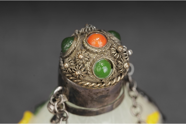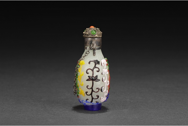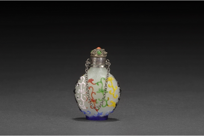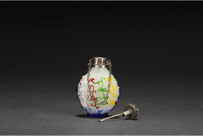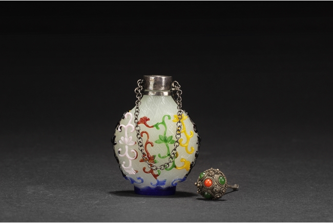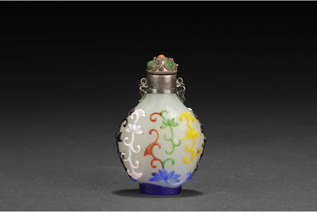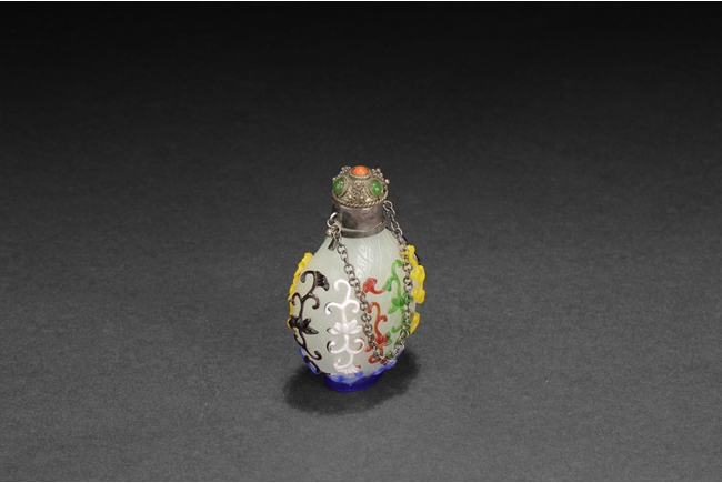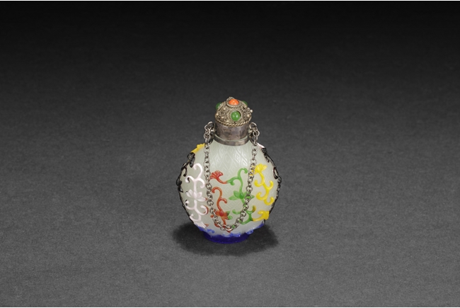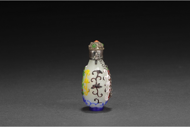 Of pear form, the glass overlay bottle with five colors of glass over opaque white glass with a silver enclosure over the neck. Provenance: Bonham's San Francisco.