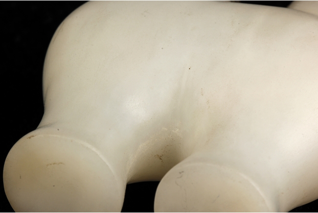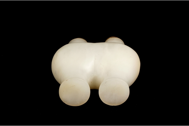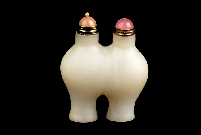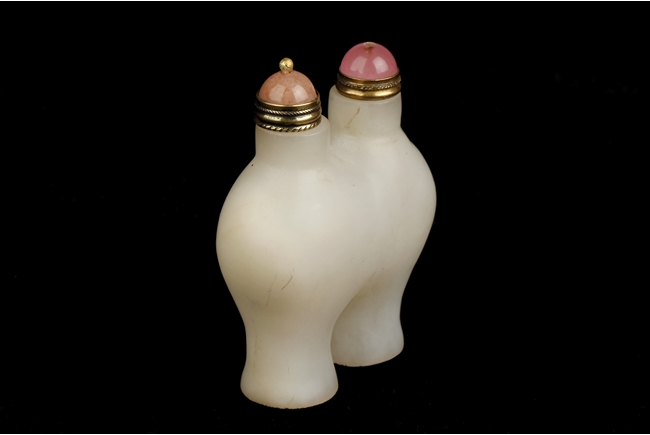 The snuff bottles linked at the body, with separate base, opening, and stopper, each shaped in ovoid form with straight neck and flared foot; the stone of translucent white color, the two stoppers with different gems. 19th century.
