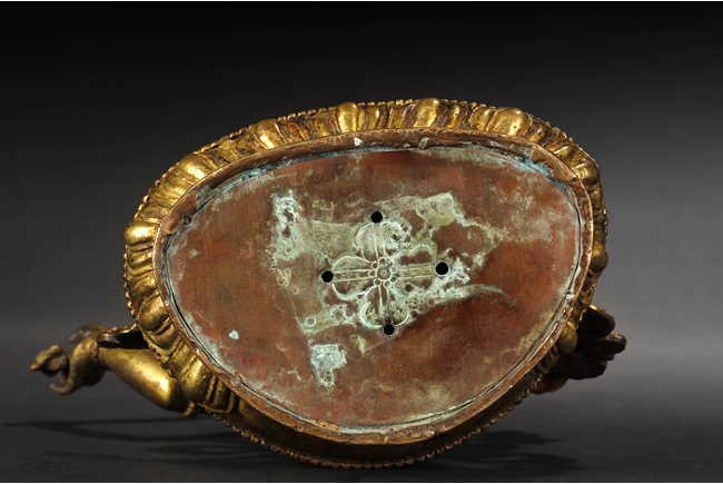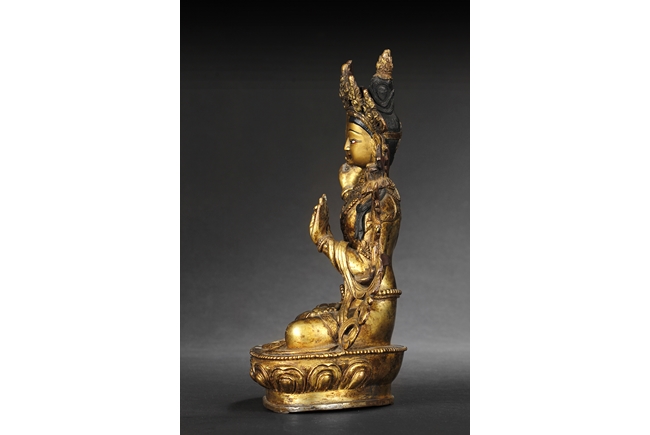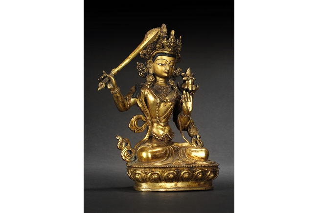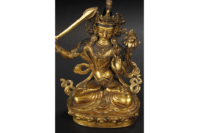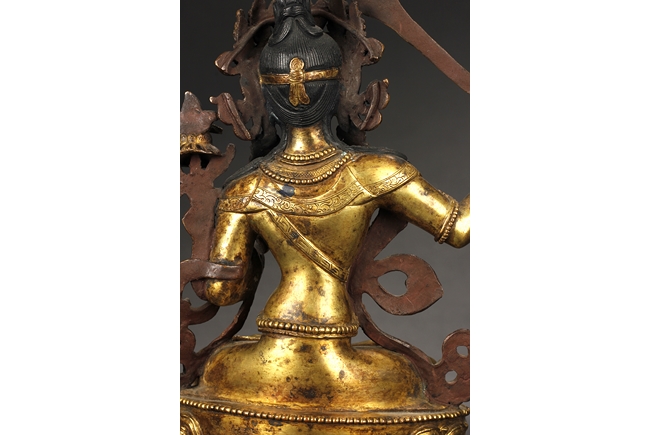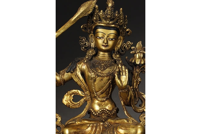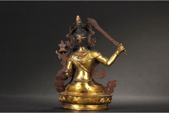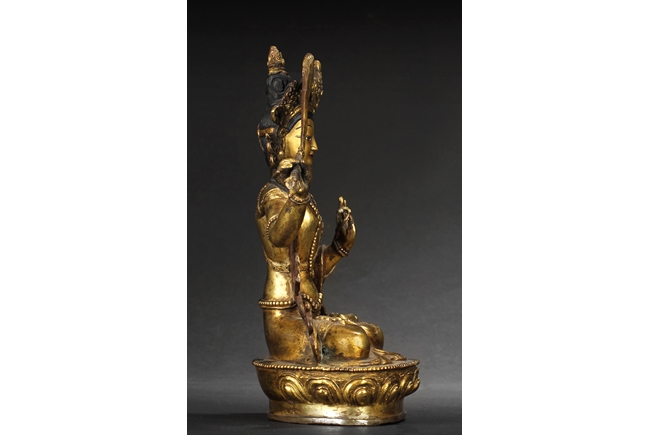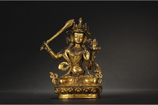 Seated dhyanasana on a lotus pad, the Bodhisattva has raised scepter in right hand, vitarka mudra with left hand, wearing flowing robe, beaded ornaments, and decorated crown, eyes open in a calm expression. Bottom bears a Buddhism symbol. 19th century.