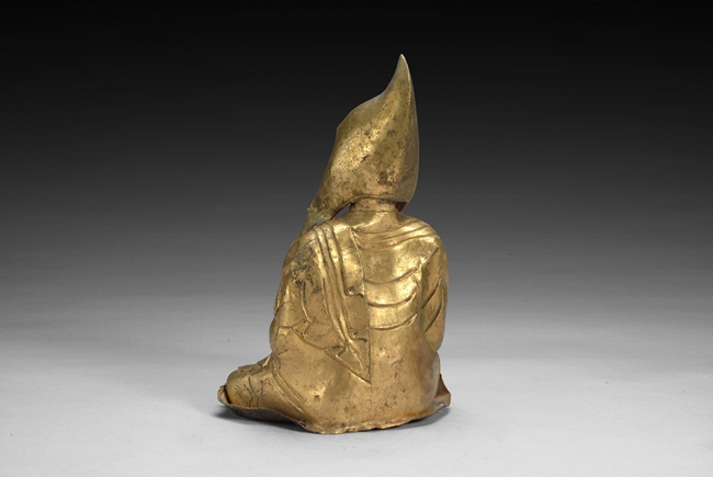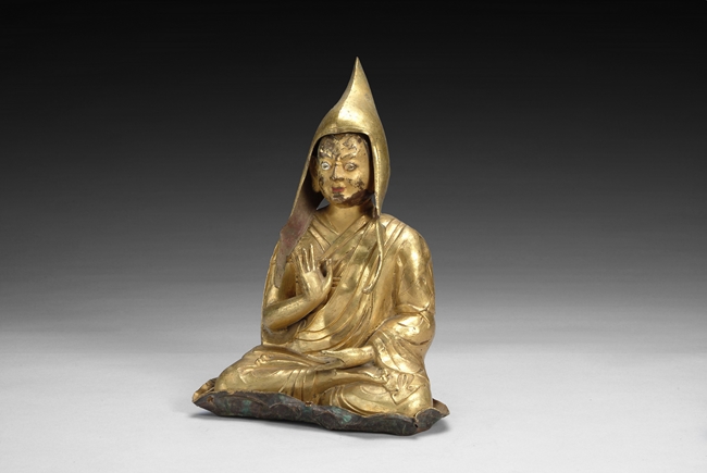The Dalai Lama is seated in a dhyanasana on top of lotus throne and wearing traditional long robe with a pointed hat; loss of some gilt and color due to age. Early Qing Dynasty period.