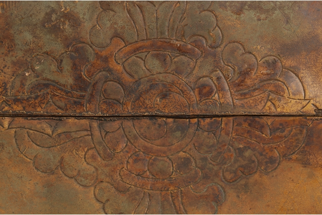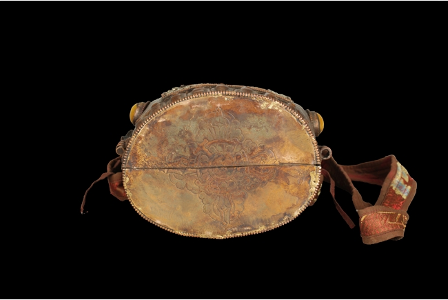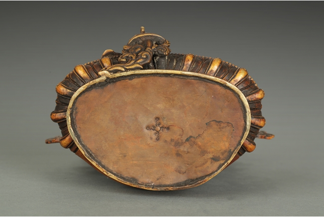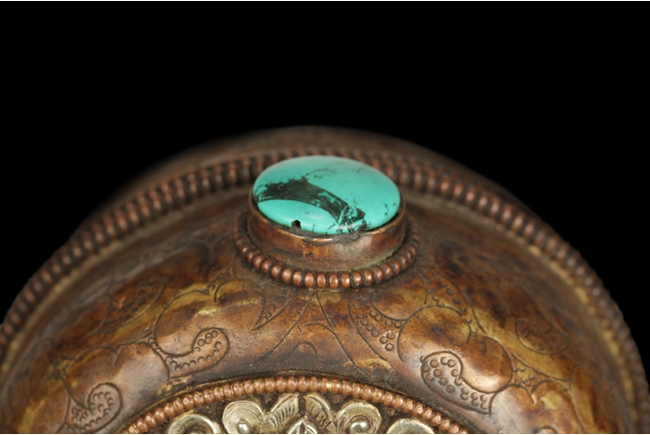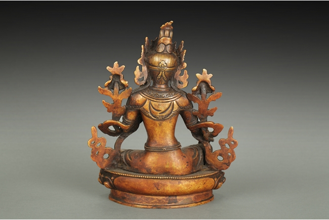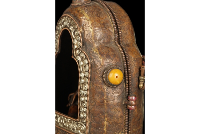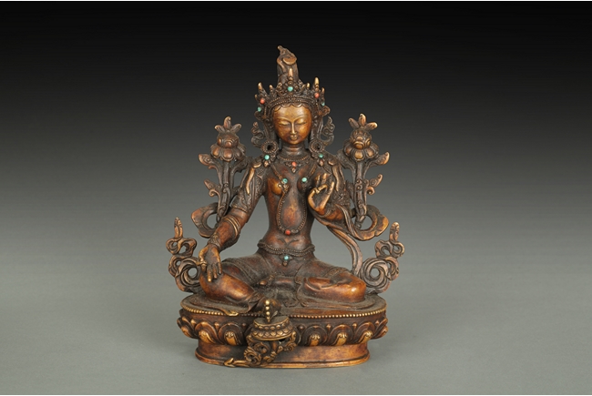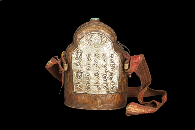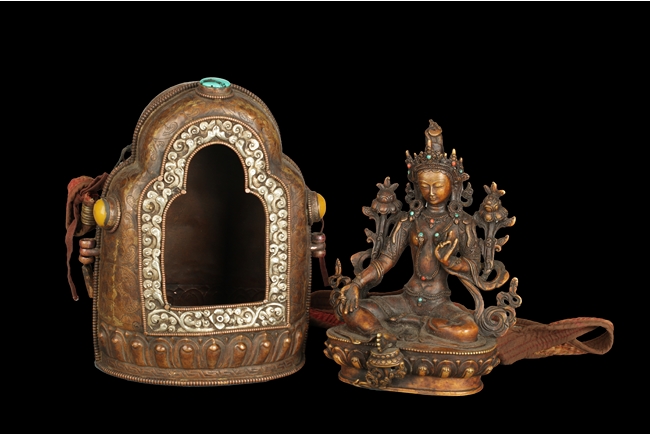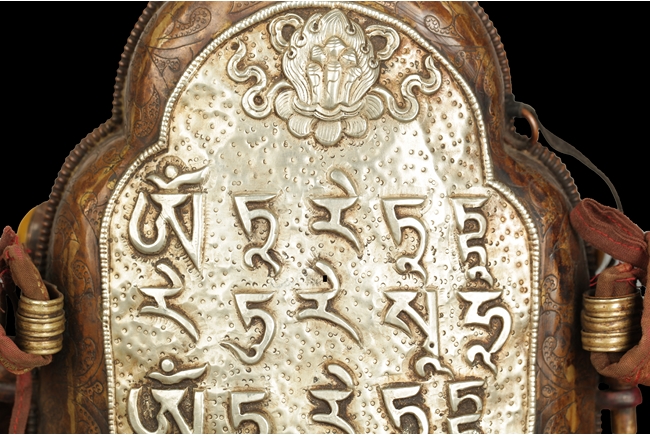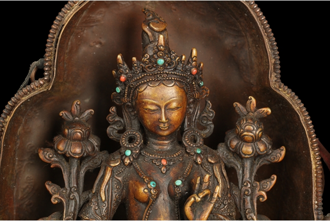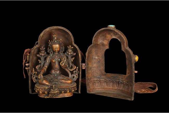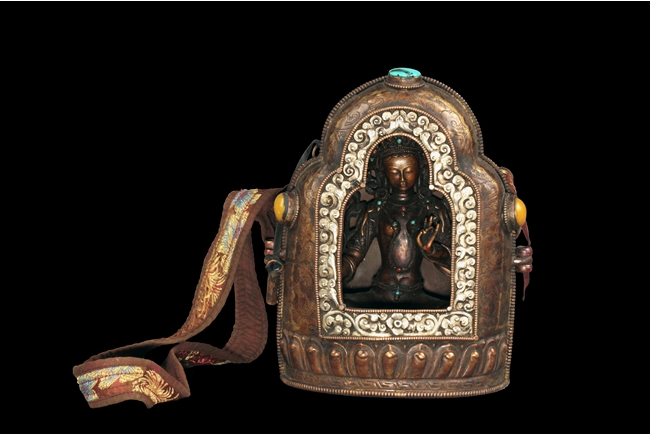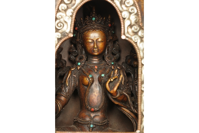 The arch shaped Gahu box casted with lotus throne and key-fret pattern on the bottom, the sides with dotted ritual patterns, the front frame in cast silver wave pattern, and the back in cast silver plaque with Tibetan verse, two amber and one turquoise ornate the sides. A Bodhivisatta situated within the Gahu box, seated in lalitasana, right hand palm up atop of right leg, lotus flowers on her sides, and decorated with beaded strands. 18th century.