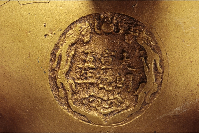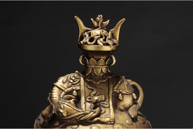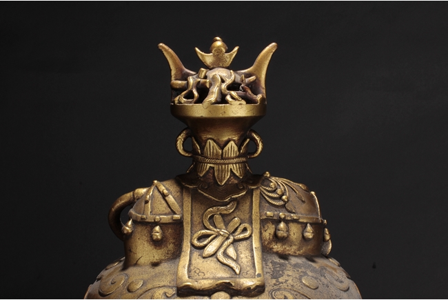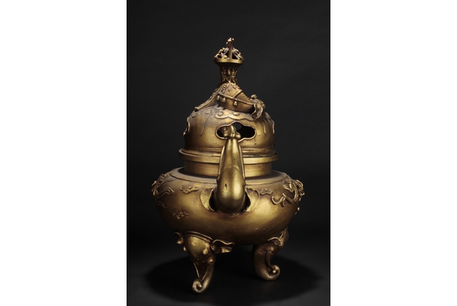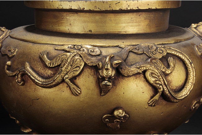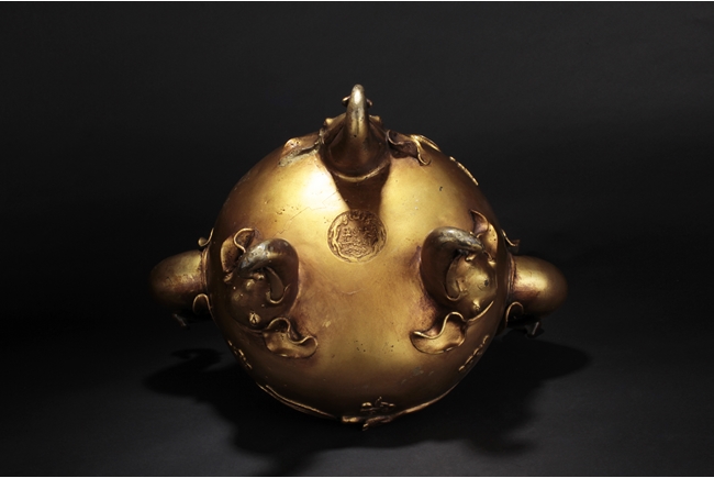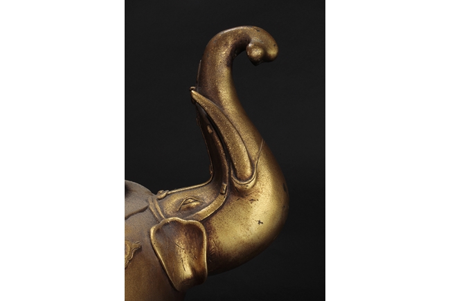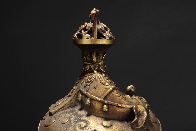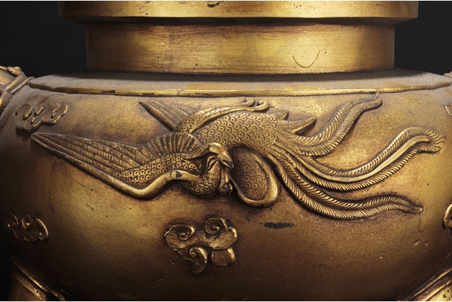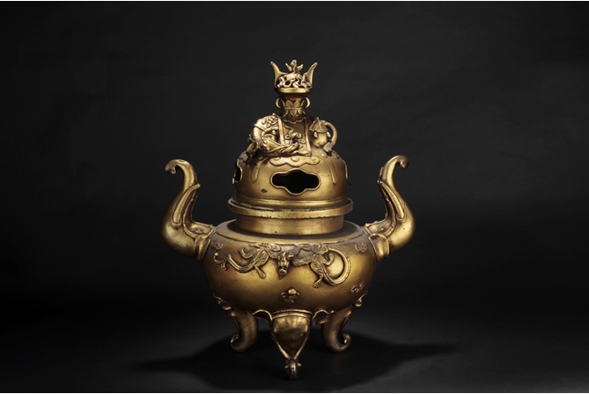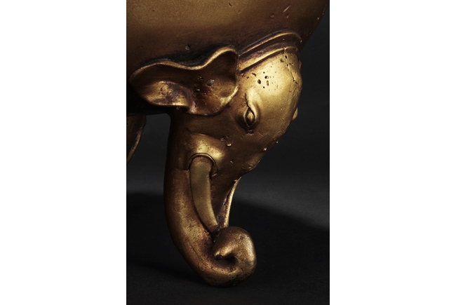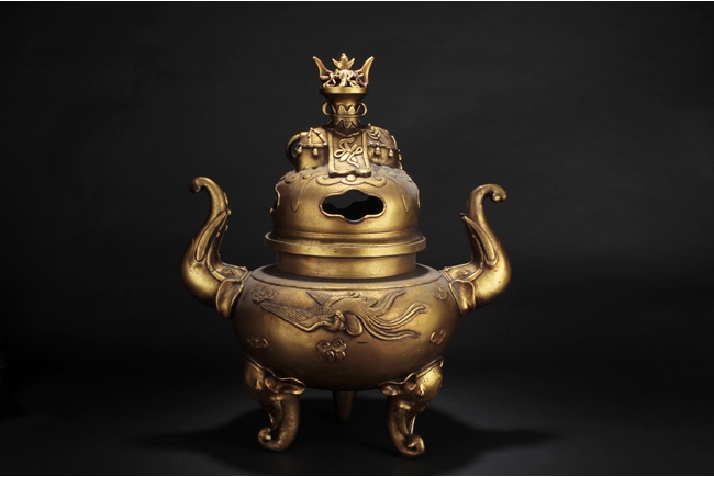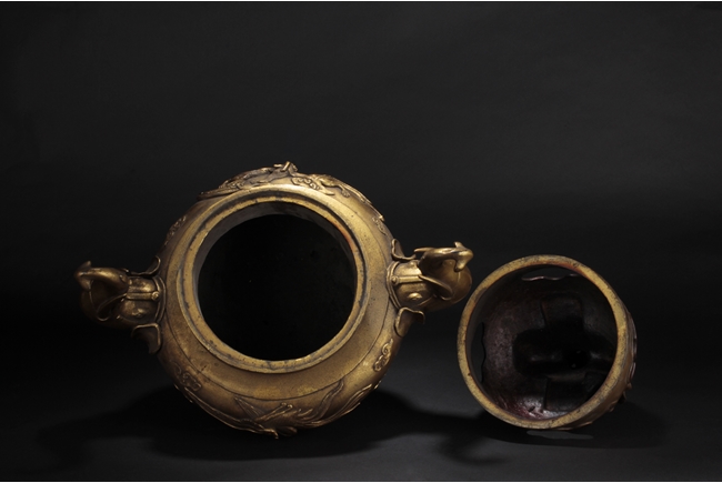 Of double gourd form, the gilt bronze censer stands on three legs extending from elephant mask, the body decorated with flying dragon and phoenix amidst clouds, a pair of rising handles extending from elephant masks in similar motif as the legs, the lid surmounted by a resting elephant carriage, and the bottom bears six characters "XUANDE" mark. 19th century.