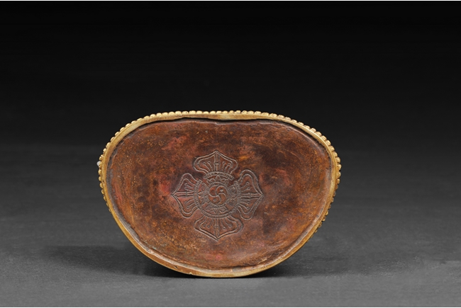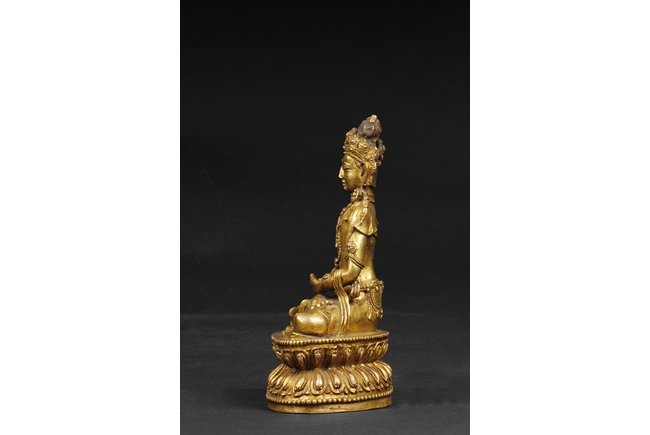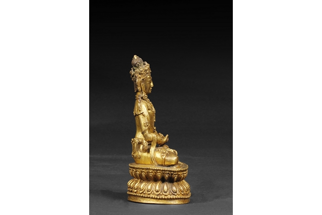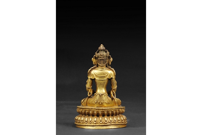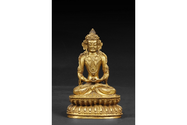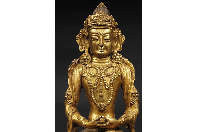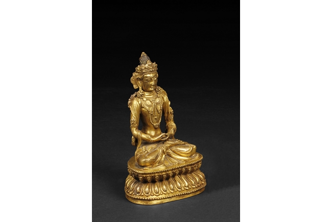 The Bodhisattva is seated in dhyanasana on double lotus throne, two hands in dhyanamudra, dressed in loose drape with beaded ornaments, with eyes closed and in a serene expression. 19th century.